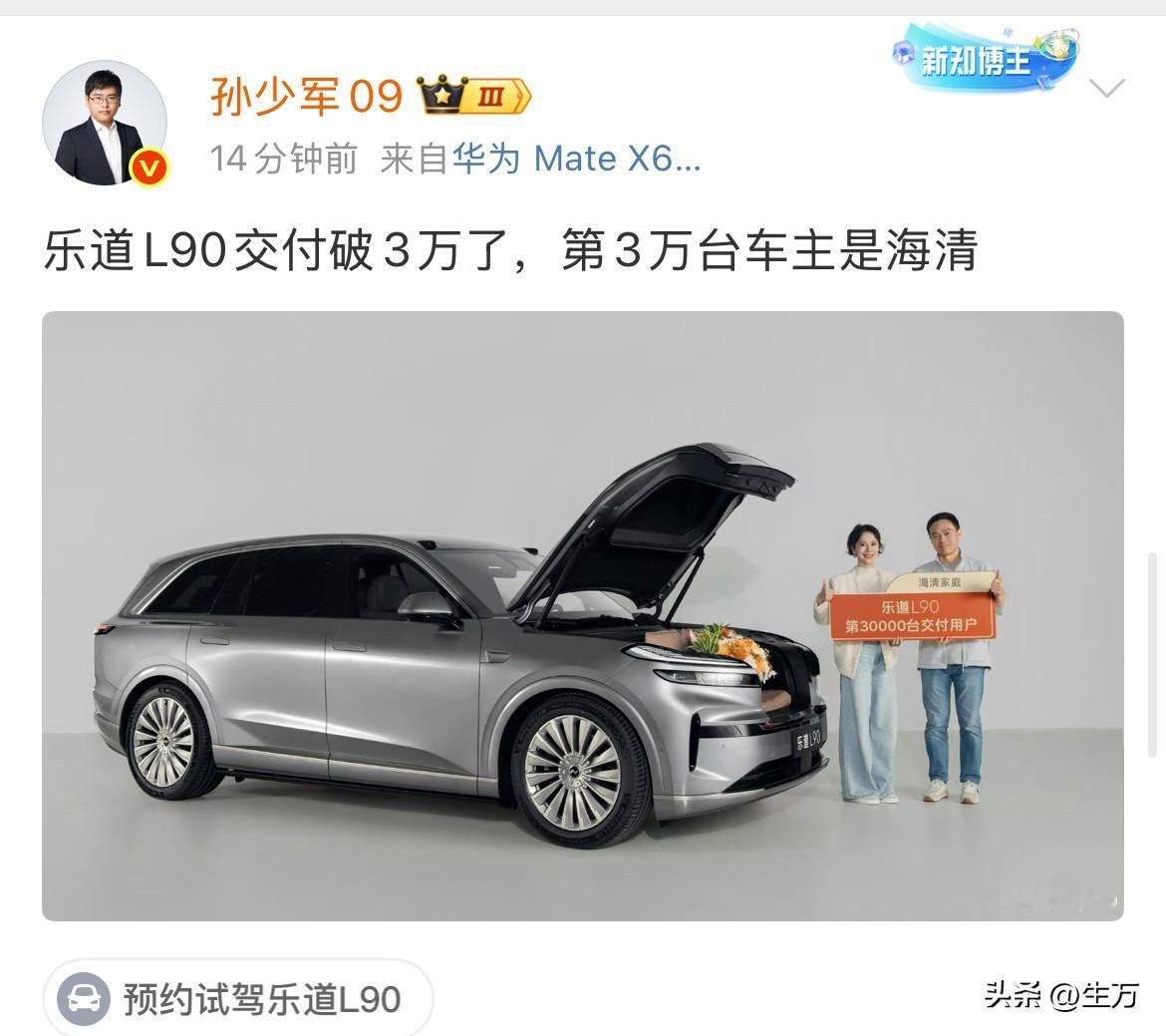 孙少军:乐道L90交付破3万了,第3万台车主是海清​​​! 就在刚才,乐道官