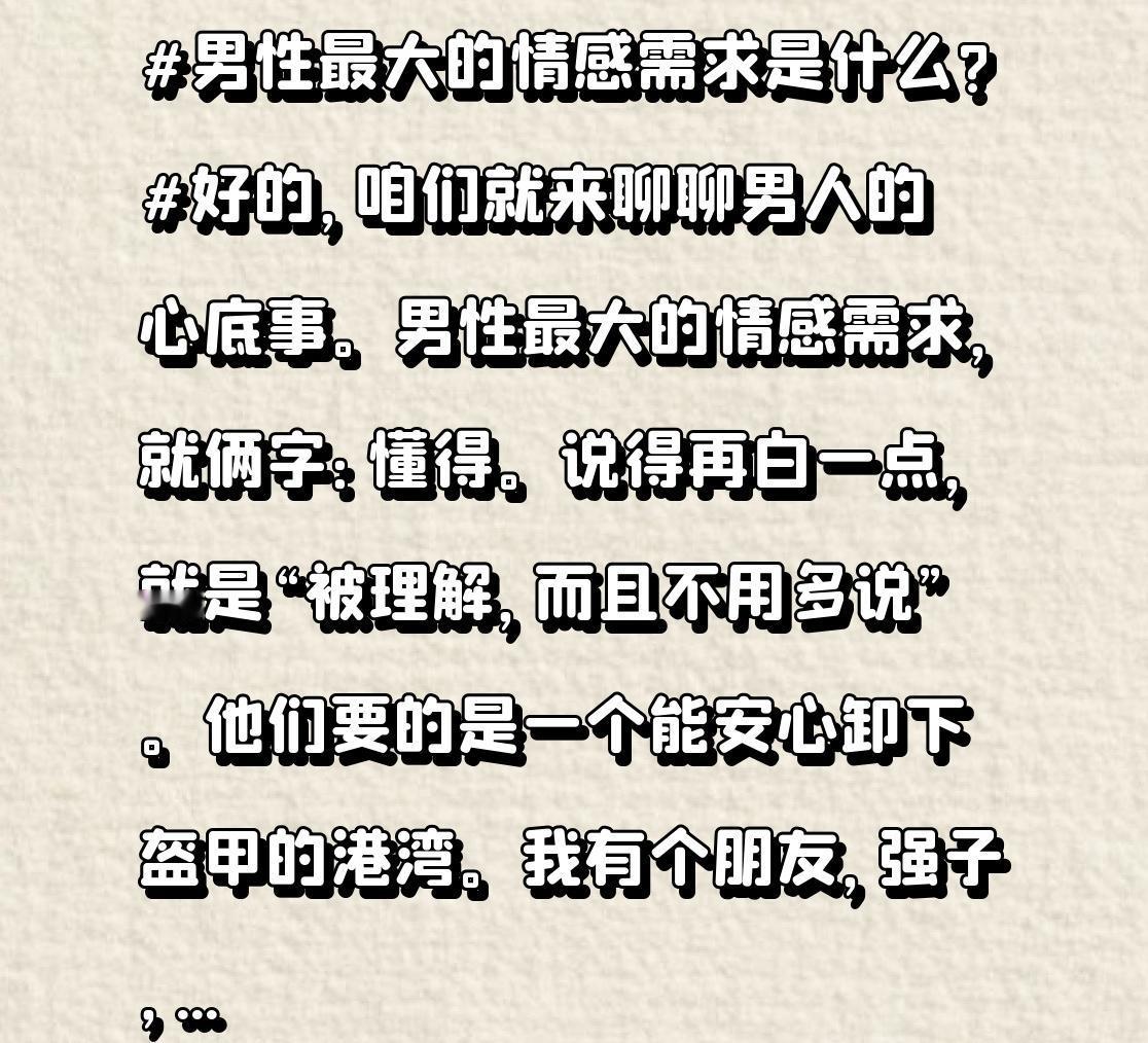 男性最大的情感需求是什么?好的,咱们就来聊聊男人的心底事。 男性最大的情感需求,就俩字:懂得。 说得再白一点,就是“被理解,而且不用多说”。 他们要的是一个能安心卸下盔甲的港湾。 我有个朋友,强子,销售主管。 外人眼里,他是雷厉风行的强人。 谈业务,带团队,仿佛无所不能。 但上个月,他搞砸了一个重要项目,团队士气低落,他自己也备受打击。 那天下班回家,他满脸疲惫,一言不发。 他妻子看到了,没追着问“怎么了?”,也没唠叨“下次注意点”。 她只是给他倒了杯茶,坐在他身边,轻轻说了句:“这阵子,你压力太大了。” 就这一句话。 强子后来跟我说,他当时鼻子一酸,差点没忍住。 他说,那一刻他需要的不是解决方案,也不是鼓励加油。 他需要的,就是有人能看穿他的坚强,理解他背后的累和不容易。 这份“懂得”,让他瞬间放松。 他知道,在外面无论多狼狈,家里有个懂他辛苦的人。 第二天,他感觉自己又充满了电,能继续出去“战斗”。 男人要的其实很简单。 不是你多漂亮,多能干。 而是在他失败时,你能说一句“我懂”,而不是“我早就说过”; 是在他沉默时,你能陪着,不把他当闷葫芦; 是在他扛着所有时,你能轻轻拍拍他的肩膀。 这份“懂得”,比任何崇拜和照顾都珍贵。 它让一个男人觉得,自己所有的奋斗和坚持,都有了归宿。 懂得,就是一个男人最硬核的情感加油站。