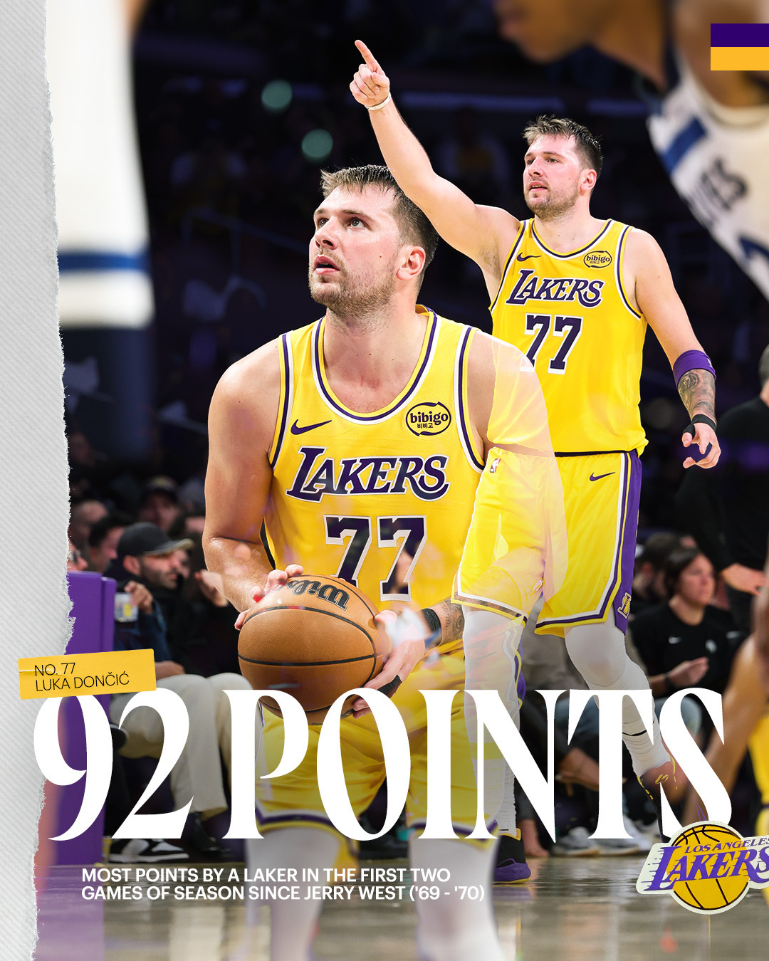 东契奇谈到他成为队史第一个在赛季开始时连续两场都达到 40 分的湖人球员:“感觉棒极了。真希望我们能赢下第一场比赛……我想赢下每一场比赛。不过我感觉很棒。”