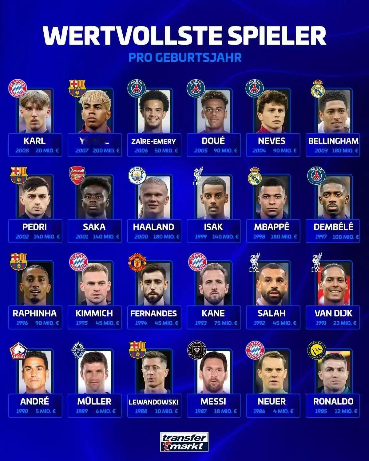 据统计,各个年龄段最贵身价的前四大高龄球员分别是C罗、诺伊尔、梅西、莱万,而这四
