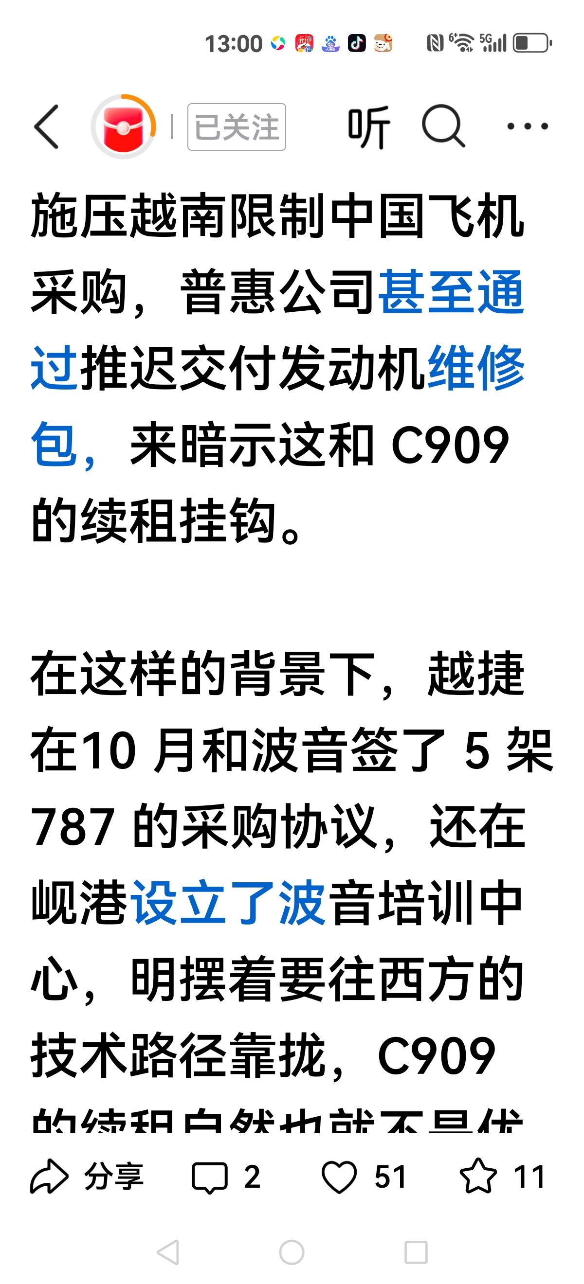 【卡脖子卡在这里】 越南飞速发展,需要客机越来越多,以前越南国内飞,采购与租赁我们的C909。 如今与外界交流多了,尤其欧美,因而对外开放越来越多,需要客机飞越欧美各国。 但我们的客机缺乏美国的FAA与欧洲EASA,只有拥有这两个证,才能飞越欧美,这一点卡住我们 另外我们的大型客机发动机维修包来自惠普公司,而对方迟迟不下发,导致交付时间推移,这也是卡脖子的一点。 所谓世界,现在看来就是欧美,很多规则与制度也是他们指定的,没有他们颁发,无法买卖。 越南最后选择波音,这也是无奈之举。 看来张,沈,高,阎的超越就算真的超越,走不出国门怎么办?