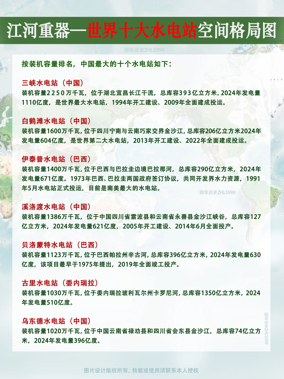 装机容量2250万千瓦,位于湖北宜昌长江干流,总库容393亿立方米,2024年发电量1110亿度,是世界最大水电站,1994年开工建设、2009年全面建成投运。