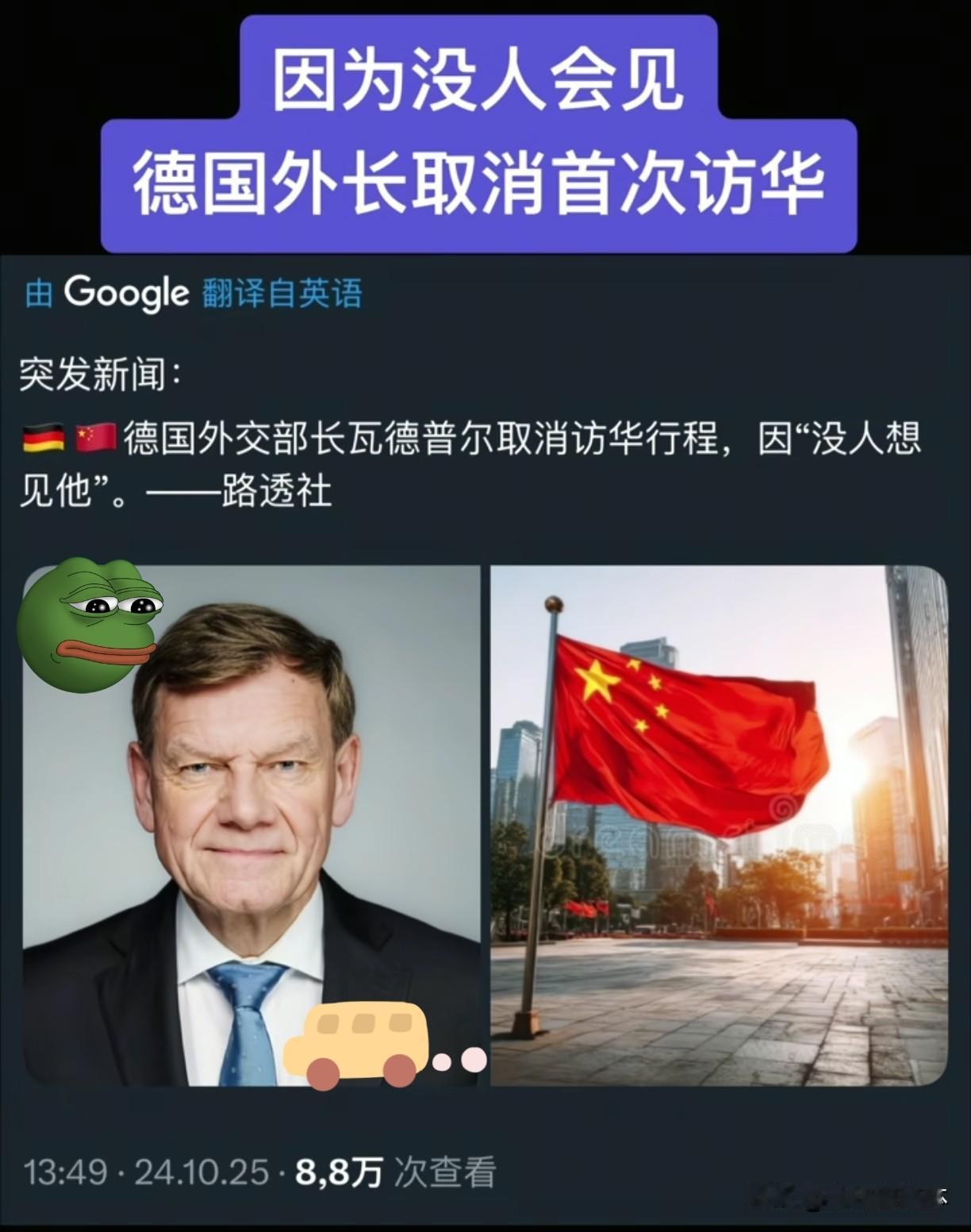 德国icon外长瓦德富尔这次可真是闹了个大笑话。 他原本计划26日访华,带着经济与政治双重任务,经济上想就关键矿产、稀土等和中方沟通,政治上要表明印太立场。 结果专机还没起飞,行程就因“未能安排足够多的会谈”被迫推迟,德方只能尴尬表示遗憾。这背后藏着更实在的原因:他出发前刚就台海问题放话,说坚持一中政策但“自行决定实施方式”,避谈反对“台独”,被中方直接点破是纵容分裂势力。一边想求中方放宽稀土出口——德国93.5%的稀土都依赖中国,车企造电动车离不了钕铁硼永磁体,库存撑不过一个半月;一边又在核心问题上挑事,这种“既要又要”的姿态,自然换不来对等沟通的机会。 他的政治任务更像自说自话,所谓“印太立场”说白了是想推“八国合作框架”,拉着日韩、澳新搞小圈子制衡中国。可德国自己的经济根本离不开中国,大众、宝马近三成利润来自中国,博世、巴斯夫还在加码对华投资,政府喊着“去风险”,企业却用脚投票,这种分裂的态度谁都看得明白。 这笑话根本是自找的,外交讲究对等尊重,不是带着要求来发号施令。想拿稀土、市场好处,又不愿在核心问题上守规矩,甚至想给中方“立规矩”,这种殖民者心态早该放下了。 德国要是真看重合作,先得摆正位置,别让政治表演盖过经济刚需。 各位读者怎么看?欢迎你们在评论区讨论。