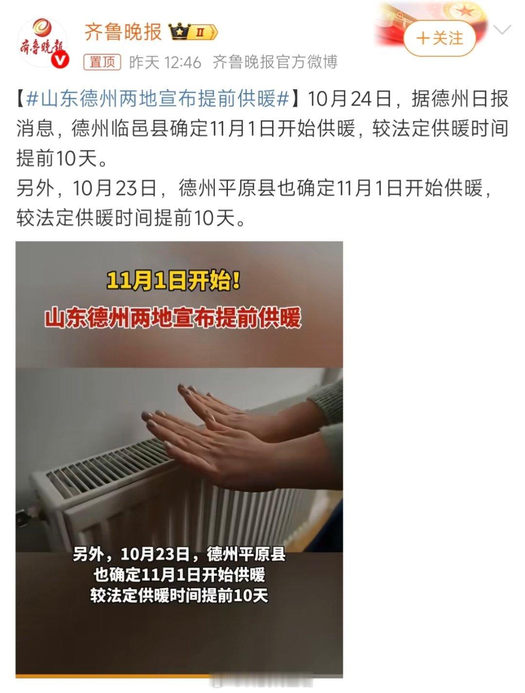 山东德州两地宣布提前供暖啊啊啊,老家的朋友真开心,可惜我大宁津还没有,过几天回老家希望暖气安排上~