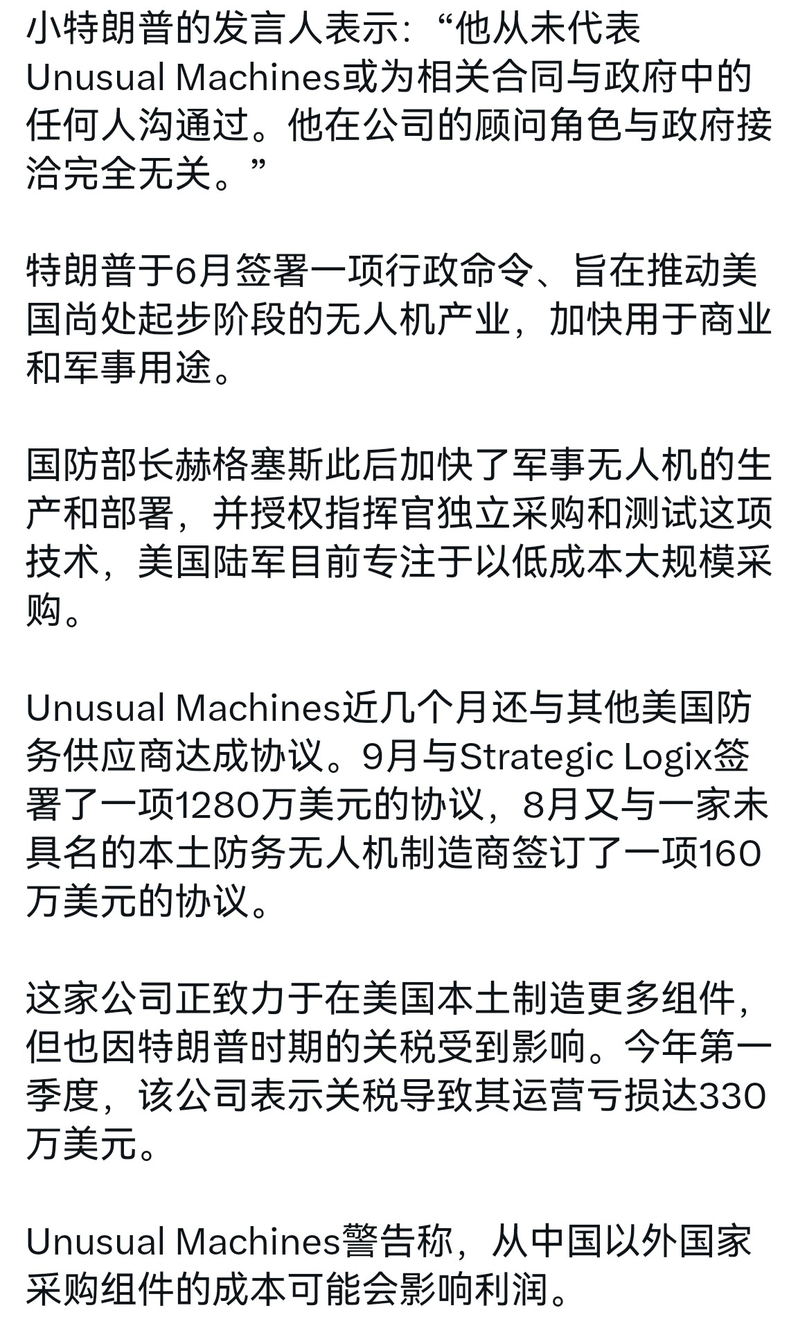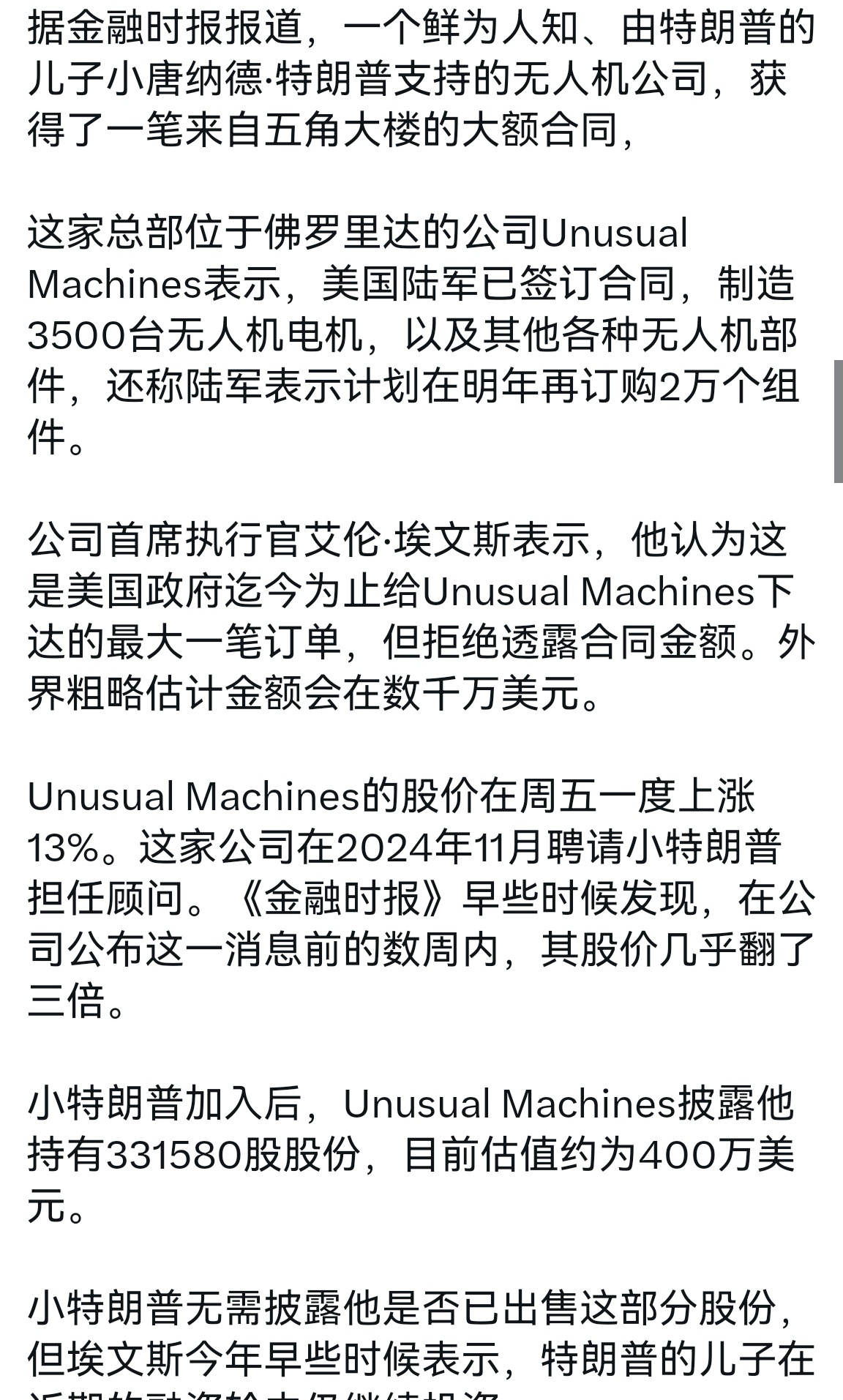 🔻金融时报报道,一个鲜为人知、由特朗普的儿子小唐纳德·特朗普支持的无人机公司,获得了一笔来自五角大楼的大额合同。