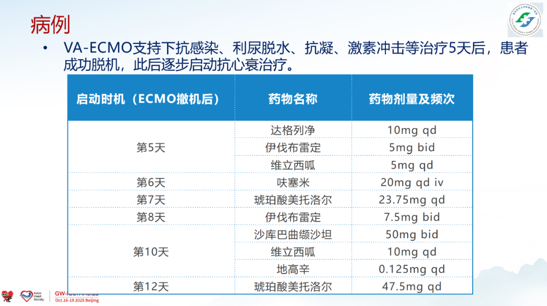随即第一时间启动了包括重症产科、心内科、呼吸科在内的多学科团队(MDT)。该患者最终在静脉-动脉体外膜肺氧合(VA-ECMO)的支持下,经过抗感染、利尿、脱水、抗凝、激素冲击及全面抗心衰治疗,5天后成功脱机,此后逐步启动抗心衰治疗(图6)。患者一个月后射血分数显著改善至39%,两年后心功能完全恢复正常。