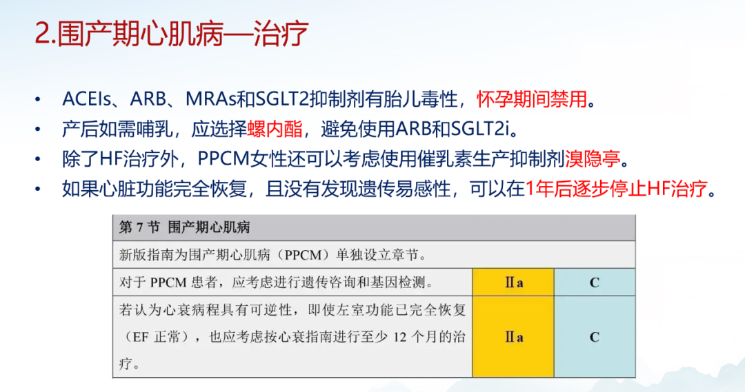 治疗需兼顾母婴安全。孕期禁用血管紧张素转化酶抑制剂(ACEI)、血管紧张素Ⅱ受体拮抗剂(ARB)、盐皮质激素受体拮抗剂(MRAs)和钠-葡萄糖协同转运蛋白2抑制剂(SGLT2i)等具有胎儿毒性的药物,产后哺乳可选用螺内酯(图4)。溴隐亭作为催乳素抑制剂,也被考虑用于PPCM的治疗。罗教授强调,即便心功能完全恢复,也需规范治疗至少1年,并评估遗传易感性。