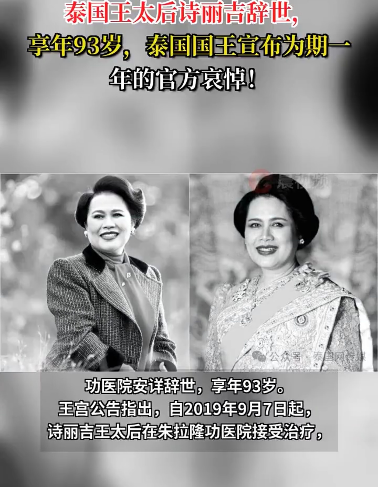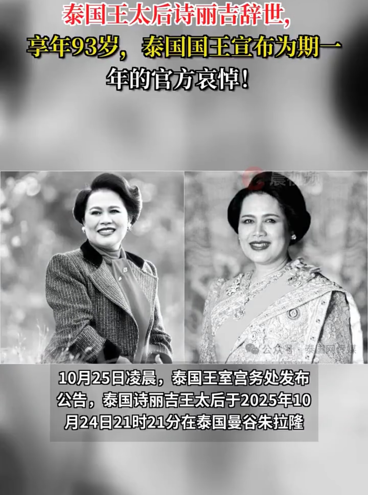 泰国宣布禁娱30天 王太后诗丽吉殿下24日离世,曼谷街头悄然换上素色。