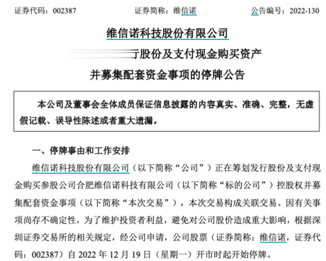 10月24日晚,维信诺发布公告,决定终止拟向合肥合屏投资有限公司(以下简称合屏公司)、合肥芯屏产业投资基金(有限合伙)(以下简称芯屏基金)、合肥兴融投资有限公司(以下简称兴融公司)发行股份及支付现金收购合肥维信诺科技有限公司(以下简称合肥维信诺)40.91%股权的交易,并向深交所申请撤回全部申请文件。