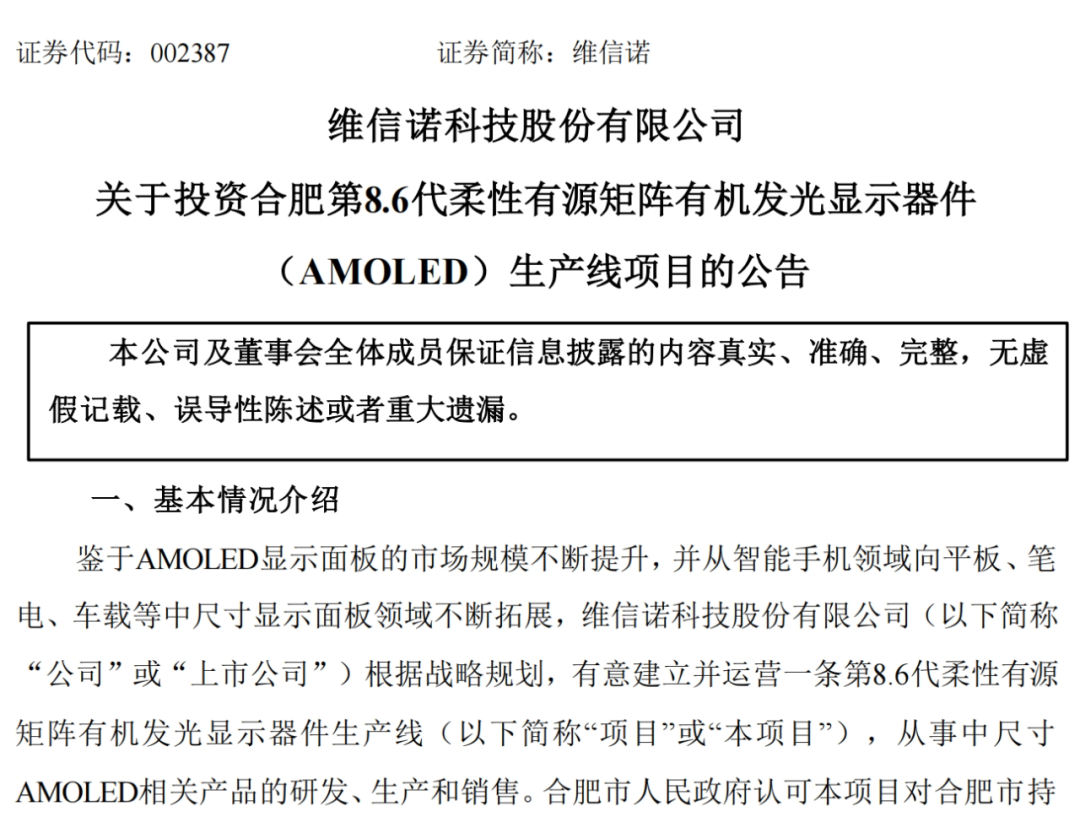 尽管如此,公司仍在押注新产线。2024年,维信诺宣布与合肥建翔投资有限公司、合肥鑫城控股集团有限公司两家国资公司合作建设第8.6代柔性AMOLED生产线,项目总投资额达550亿元,其中股权投资为330亿元、债务融资为220亿元。