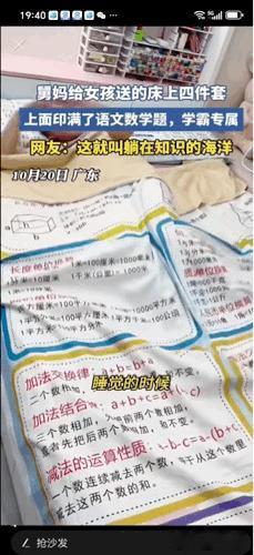 万万没想到,舅妈送了这样的礼物 真的是爱了爱了。 广东的小敏没有想到生日这天收到了舅妈送的定制礼品:一套写满了数学公式、语文题的床上四件食。小敏躺在上面睡着睡着就把数学公式、成语背下来了。 网友:这就叫躺在了知识的海洋 视频上的小女孩躺在床上,说好舒服啊,躺着就在看书背书呢。先背数学公式,再背四字成语。再接再厉、寻根问底。哈哈哈,小姑娘看的可开心呢! 原来,学习的地方无处不在,除了书房,除了课本。连睡觉都睡在了知识上面,翻个身,背个成语。睁开眼就是公式。 这让我也想想,还可不可以定制英语单词床上四件套?语文诗词?各年级的物理、化学、生物等等呢? 取材网络,侵权立删