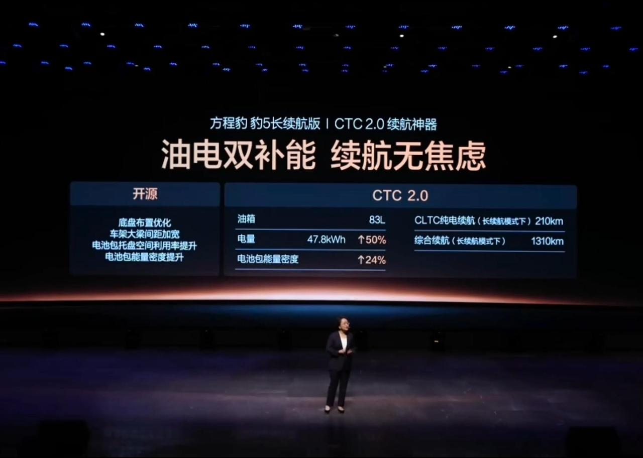 这才是新豹5的核心进步! 很多人看完新豹5发布会,可能觉得变化不大:外观细节优化、配置升级、续航提升。其实,真正的核心进步在于——CTC 2.0底盘电池一体化技术。这项技术虽然官方没怎么强调,但它才是豹5这次升级的灵魂。 简单来说,CTC 2.0把电池和底盘结构进一步融合,用液压一体成型的大梁结构,既能减重,又能提升强度。更关键的是,大梁中间的可用空间更宽、更平整,这意味着能塞进更大的电池包。 电池能量密度提升了24%,电池包体积增加了50%,让新豹5的CLTC纯电续航从125km直接拉到210km,提升幅度相当可观。而且,它在做到更长续航的同时,还保持了原本83L的大油箱,混动系统的长途补能能力没有受影响。 从工程角度看,豹5这次算是同时解决了“三难问题”:轻量化、强度、续航。这种变化不像外观那样直观,但对整车性能、油耗和安全性影响极大。 很多人说“看不见的升级最贵”,这句话放在豹5身上非常合适。CTC 2.0不仅让它更省、更稳、更安全,也让增程SUV的技术上限再往前推了一步。