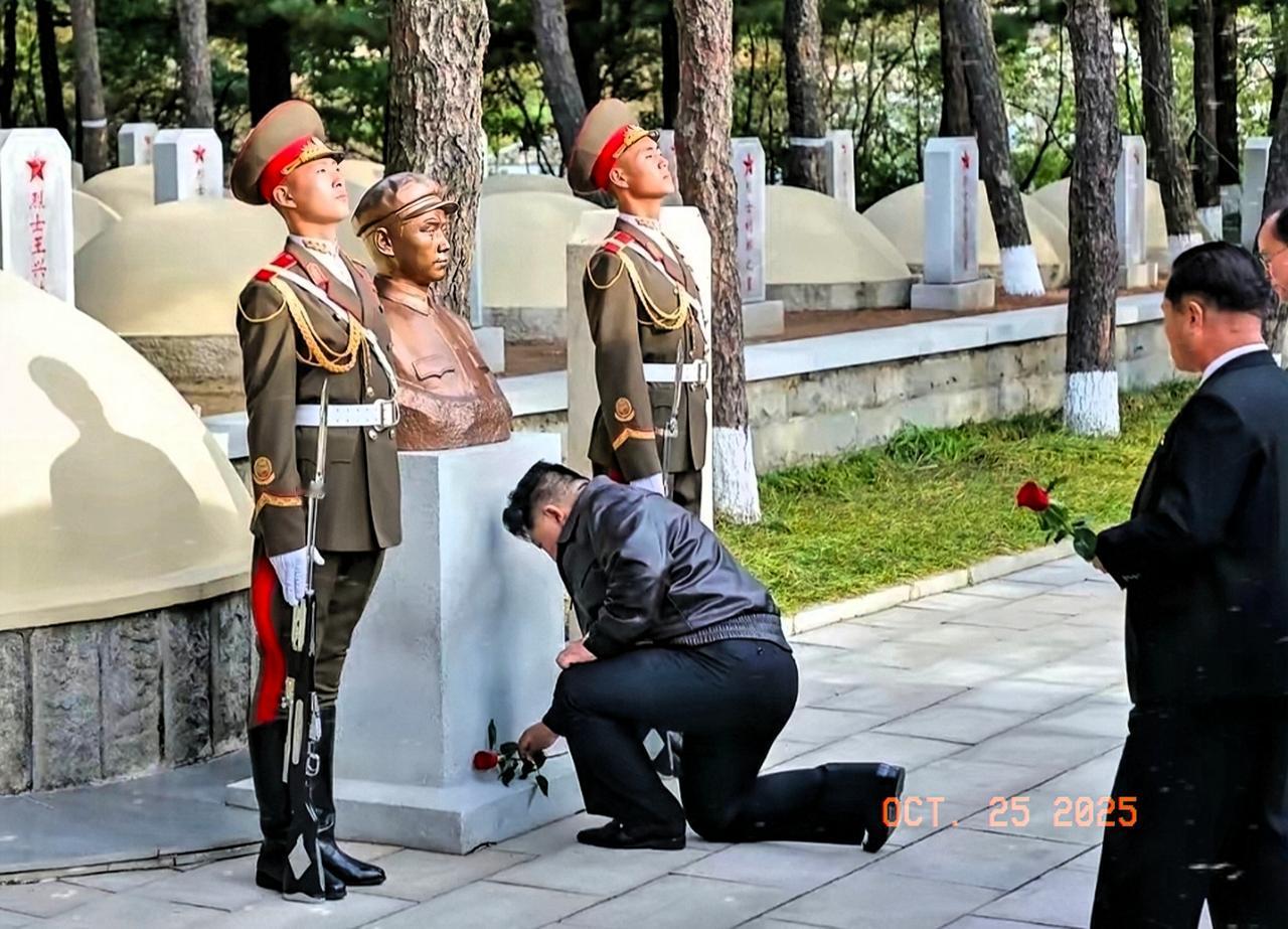 金元帅这一跪, 跪出了中朝永远不变的友情!凭吊毛岸英墓的一幕,更是是跨越时空的精神共鸣,更是中朝情谊的具象写照! 在志愿军出征75周年之际,他单膝跪地 ,手撑大腿的姿态,绝非寻常礼节,那是对为朝鲜捐躯咱们英雄烈士的最高敬畏,是对两国并肩作战岁月的深切回望,他的每一个动作都沉淀着中朝共同抗敌的历史记忆。 手握不知名的叶绿花红,褪去了学名的桎梏,反倒成了最纯粹的敬意载体。我的理解为,绿叶是生生不息的传承,红花是炽热不变的缅怀。 这已经不是简单的祭奠,而是用最质朴的方式,向牺牲的中方英雄致敬,向牢不可破的中朝革命情谊致意,让跨越国界的信仰与感恩,在静默的仪式中愈发厚重绵长。