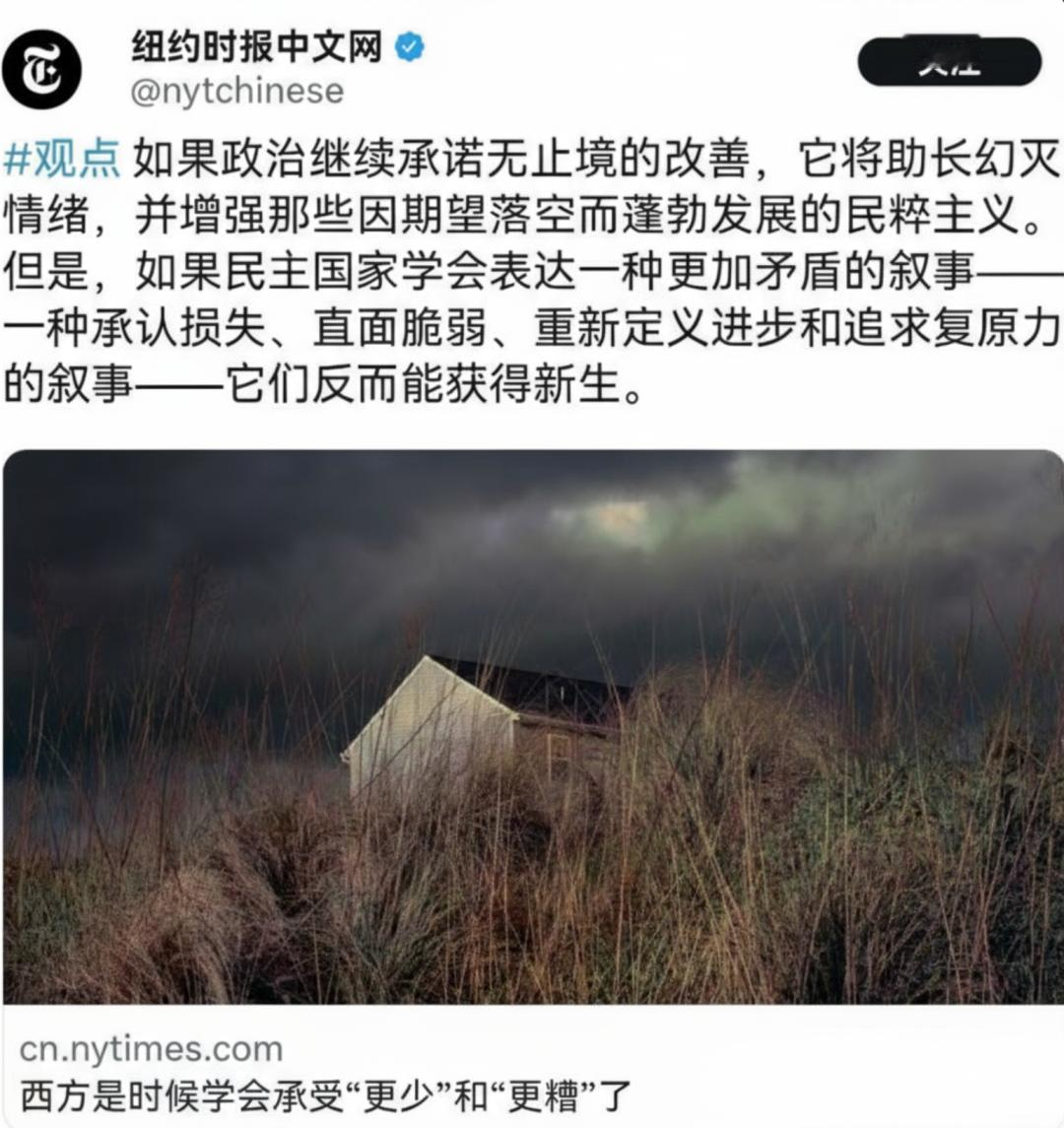 就在贝森特踏上忐忑之途的时候,纽约时报刊了一篇文章《西方是时候学会承受“更少”和“更糟”了》。