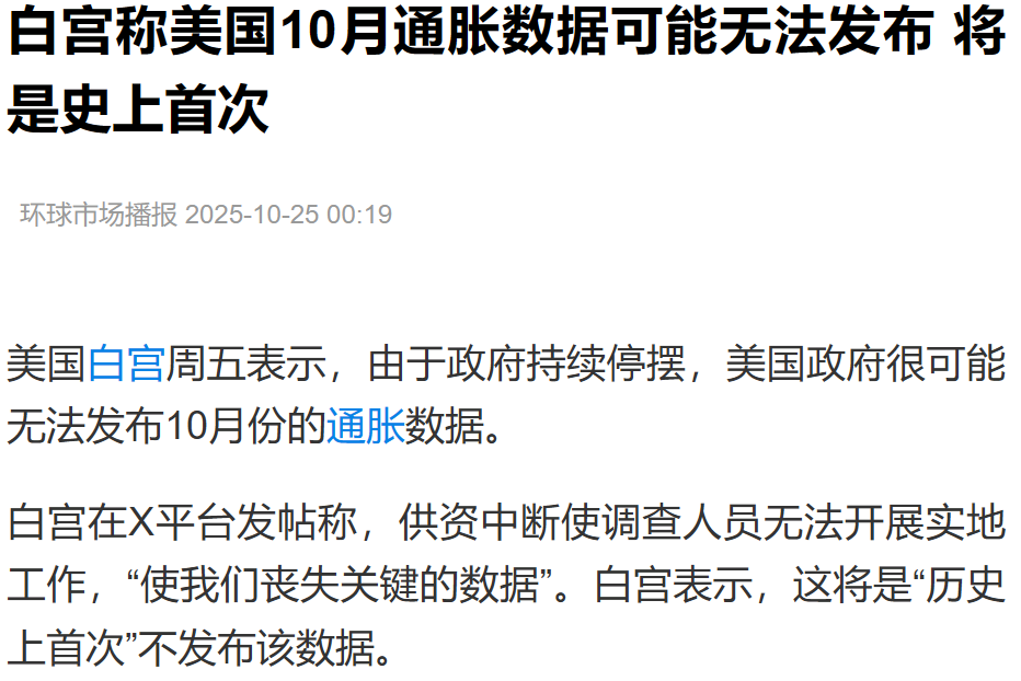 首先,美国昨天宣布,因为政府关门,所以十月份的通胀报告不再公布。但花街很多传闻说,美国的通胀报告,有可能发生了类似于前几个月就业报告一样的造假事件。之前被开除的劳工统计局长,人为硬造出了几十万新就业的数字,而修正之后,新增就业反而是负数。通胀之前是2%,可大家都知道那是瞎写的。根据传闻,十月不发通胀报告,等到十一月甚至十二月发报告的时候,通胀数字会“统计修正”到5-7%,而这个数字才比较贴近美国人日常生活的体感。