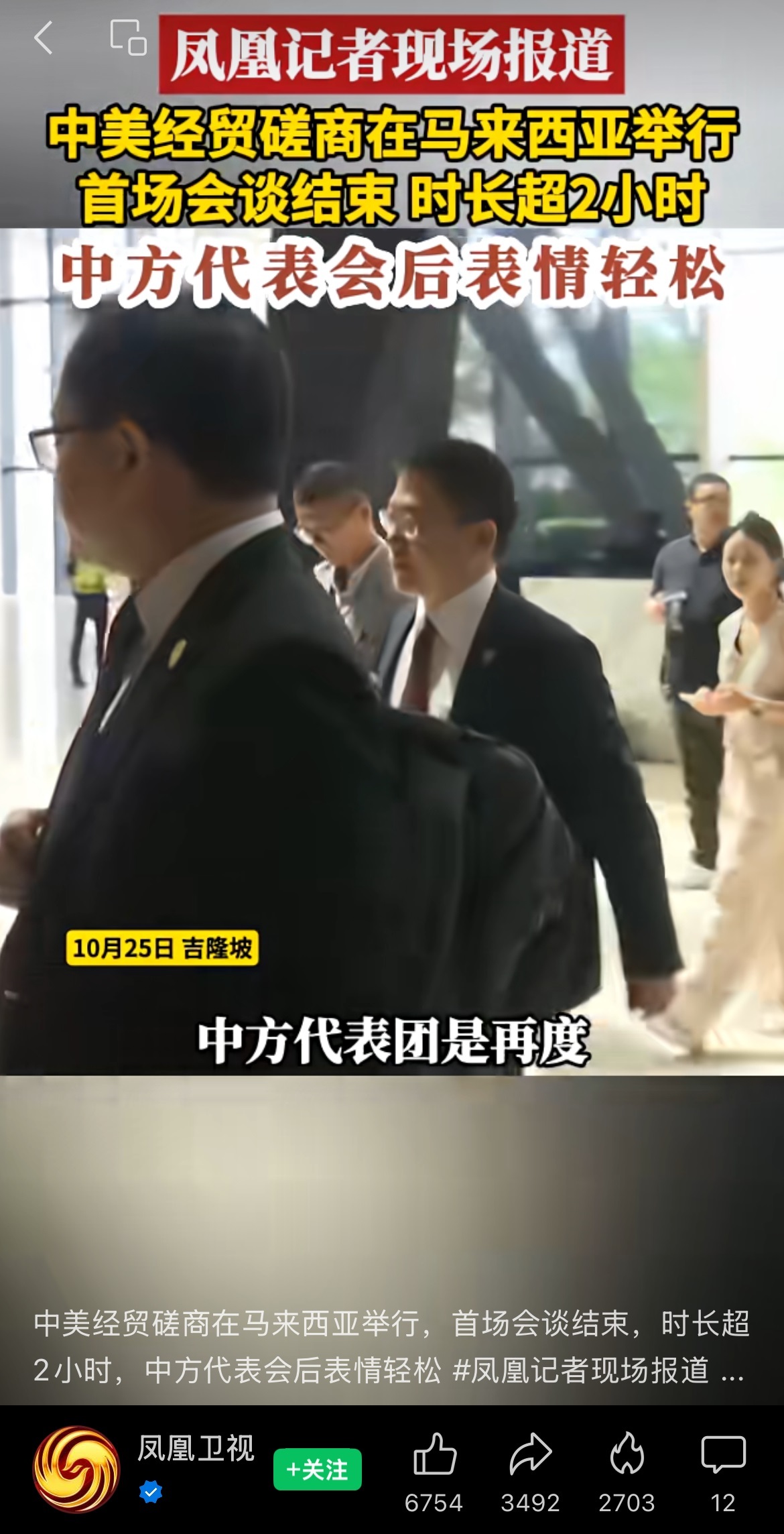 后续根据凤凰网的报道,在两个小时的会谈的结束后,中方代表离开时表情轻松。而美国财政部官员则表示:首场会谈已经结束,非常有建设性,周日上午会继续进行会谈……[思考]烽火问鼎计划中美在马来西亚经贸磋商
