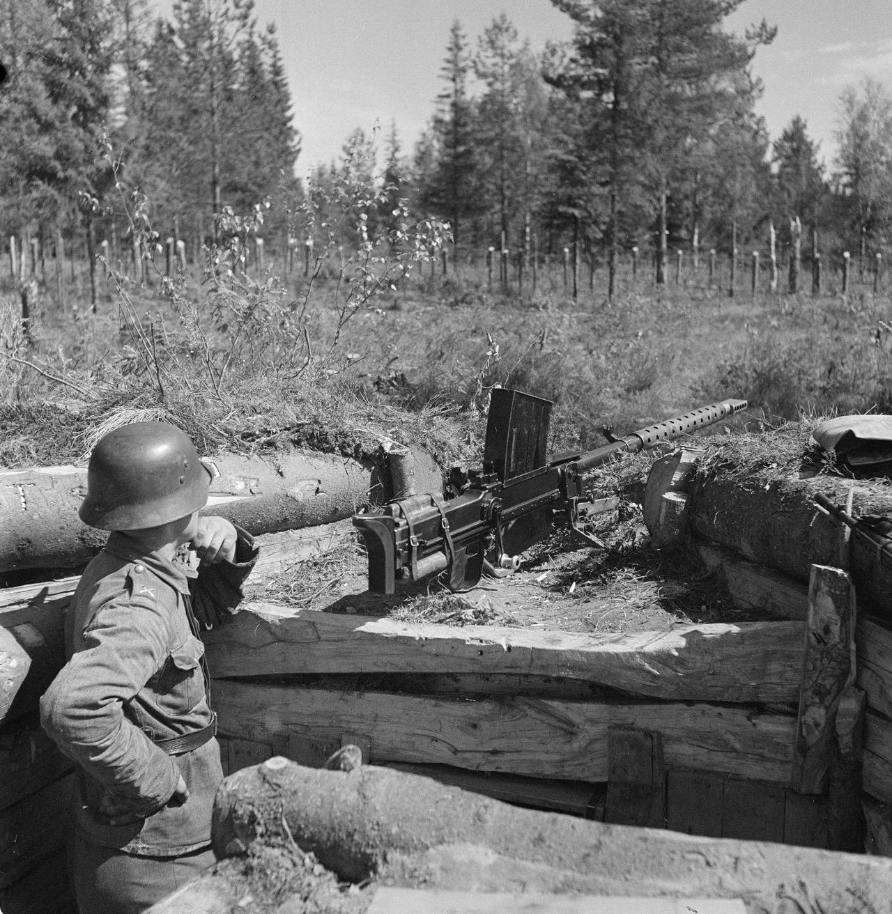 [呲牙] 芬兰的“大象枪”——1942年6月,奥赫塔河畔,一名芬兰士兵在阵地上警戒,他面前是一挺20毫米口径“拉蒂” L-39型反坦克枪。 “拉蒂” L-39型反坦克步枪是芬兰枪械设计师艾莫·拉赫蒂(有时候也翻译为“拉蒂”)研制的20毫米口径反坦克武器,采用半自动工作原理和可调节两脚架,因其巨大后坐力被士兵称为“大象枪”~参见图2,大家可以看出其体积惊人。 奥赫塔河是流经列宁格勒东北部的河流,1941~1944年间成为芬兰军队对列宁格勒围城战线的重要组成部分。