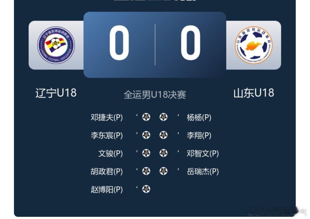 恭喜辽宁U18男足在点球大战中以5比4战胜山东U18男足,夺得第15届全运会男足U18组冠军!恭贺!山东队虽败犹荣,幸运站在了辽宁全运队一边!⚽️