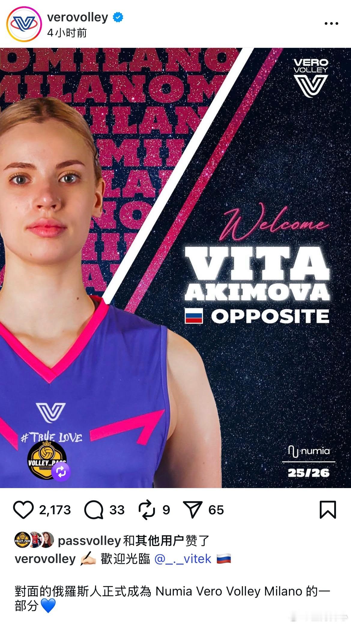 意甲女排米兰俱乐部在官方ins正式宣布阿基莫娃回归,看来是伤愈了世界女排新闻