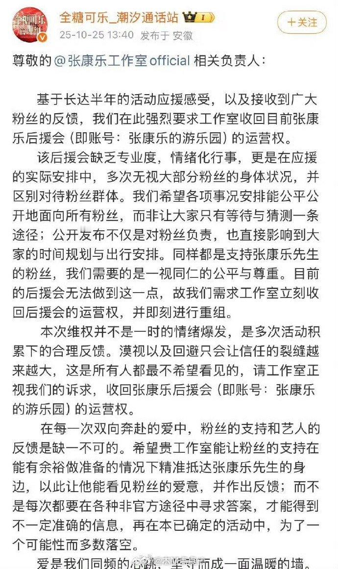 脑子不够用了,全糖可乐cpf,向张康乐工作室维权,要求张康乐工作室收回唯粉的后援会的运营权 ???[泪奔]