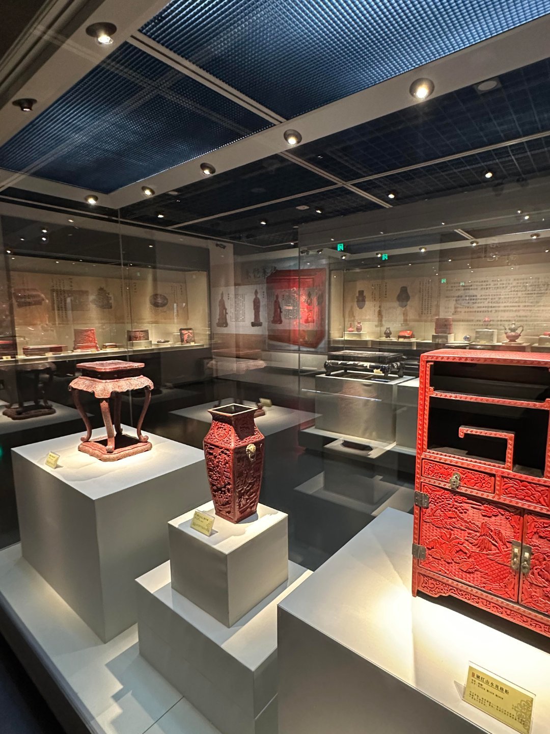 一楼是漆器博物馆,堪称“中国奢侈品展厅”。这里以精美的剔红漆器为主,藏品多为清代文物,也不乏创汇时期的精品,每一件都透着深厚的历史文化底蕴,远比普通奢侈品更有韵味。