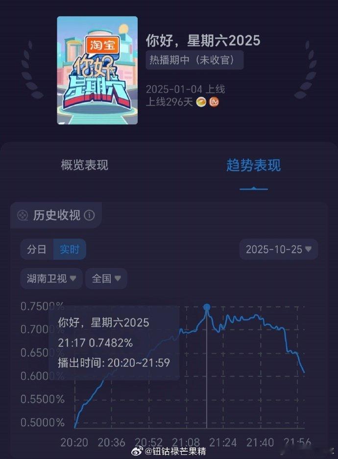 hi6实时收视第一Hi6 这数据也太能打了,酷云实时收视走高,直接拿省级第一,峰值还破 0.7482%!你好星期六