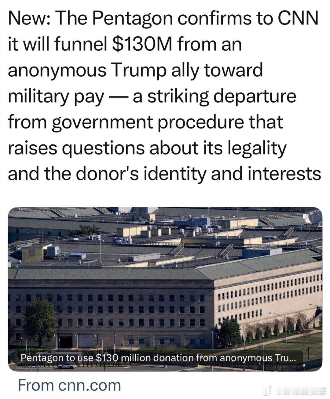 国防部向CNN确认:接受了$1.3亿匿名个人捐赠,给军人发工资