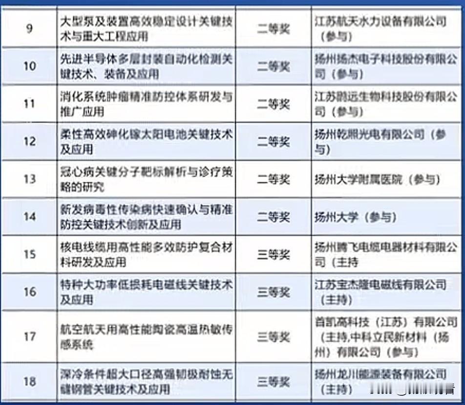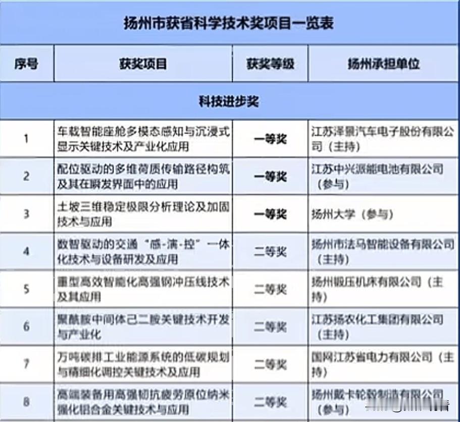 扬州太牛了!27项省科技奖刷屏,硬核实力藏不住✨ 谁还在说扬州只有烟花三月?最新省科技奖公示直接用实力破圈!27个项目强势入围,较去年翻倍增长,创下历史最佳成绩🇨🇳 作为江苏科技领域的最高荣誉,能拿下这些奖项含金量绝了!科技进步奖一等奖就占了3项,二等奖11项、三等奖11项,还有2项自然科学奖三等奖,妥妥的"高端引领+梯次发展"格局 。 更惊喜的是咱扬州企业的"主力军"表现!江苏泽景汽车电子凭实力斩获科技进步奖一等奖,中兴派能、扬农化工这些眼熟的企业也纷纷上榜,从新材料到高端装备,从智能电网到汽车电子,全是硬核赛道 。 高校和医院也超给力!扬州大学参与的项目拿下一等奖,苏北人民医院更是一举斩获4项奖项,产学研协同发力的感觉太踏实了 。 我以前总爱夸扬州的慢生活,现在发现这座城市的创新节奏根本停不下来!从田间的育种技术到车间的高端装备,科技感早已融入城市肌理。为家乡的硬核进步狠狠骄傲,扬州未来可期🌟