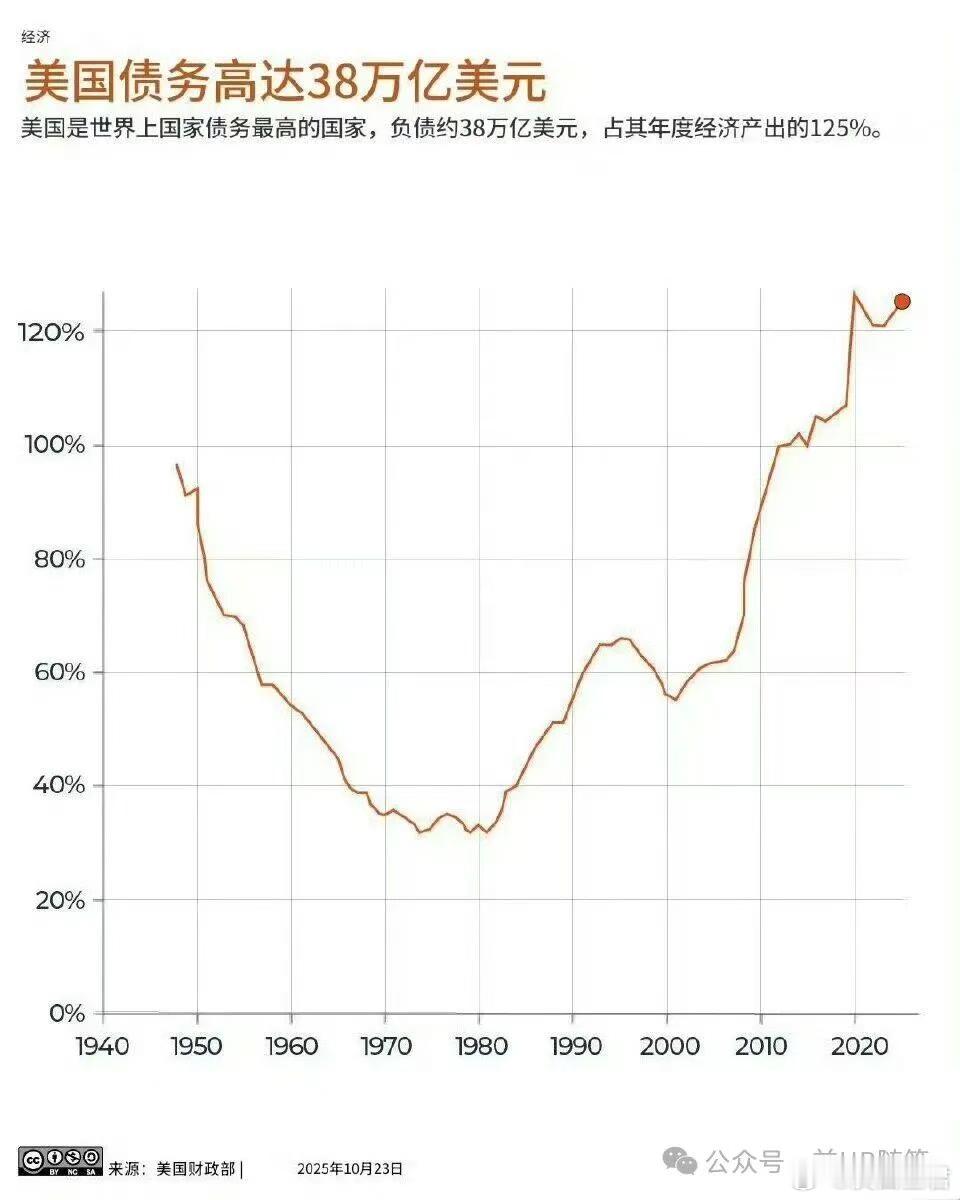 美国国债的增长曲线早已脱离理性轨道。2024年1月尚停留在34万亿美元,7月突破35万亿,11月迈过36万亿;2025年8月达37万亿,短短两个月后的10月便触及38万亿新高 。这意味着年均新增债务已稳定在2万亿美元以上,是2000年以来平均增速的两倍 。占GDP比重已经超过二战时期。驱动这场“狂奔”的是三重枷锁,社会保障、医保等强制性支出占比已达财政总支出的73%,压缩了政策调节空间;特朗普“大而美”法案延长减税措施,预计未来十年减少4.5万亿美元收入;加息周期叠加债务规模扩大,未来十年利息支出将从4万亿飙升至14万亿美元 。收入缩水与刚性支出的剪刀差,正让债务黑洞越撕越大,美国很快利息开支就会超过军费的。