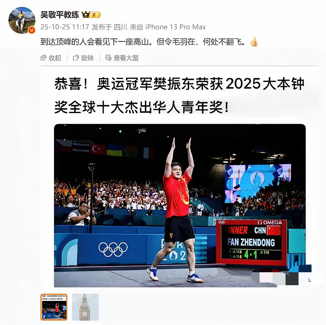 樊振东,传喜讯! 10月24日,大本钟奖颁奖典礼在德国汉堡举行,颁奖仪式上,大本钟奖组委会华裔创始人李俊辰教授揭晓了2025年度大本钟奖全球十大杰出华人青年奖荣誉获得者,奥运乒乓球冠军樊振东在列。 这奖可真不是随便拿的。被称作“华人青年领域达沃斯”的大本钟奖,选的从来不止是“有成绩的人”——年龄得在40岁以下,得有国际影响力,人品还得过硬,每年全球提名超不过20人,最终能站上领奖台的没几个。能和金庸、姚明这些各领域翘楚同列,樊振东靠的绝不止那112座冠军奖杯。 谁还记得当年那个被张继科喊“小胖”的少年?12岁就离开家进八一队,小学刚毕业就把训练馆当成了家,数不清的挥拍、体能课,硬生生把自己磨成了15岁就能打败王励勤的“天降奇才”。17岁拿波兰赛冠军时,他脸上还有婴儿肥,可握球拍的手已经布满老茧,那时候外界只看到他“出道即巅峰”,没看见他背后是“把每一次训练都当决赛打”的狠劲。 他最让人佩服的从来不是一直赢,而是跌下去还能爬起来的韧劲。2019年那阵“技术危机”有多痛?被对手研究透,世乒赛连八强都没进,铺天盖地的质疑说他“要被时代淘汰了”。可他没歇着,在训练馆里多泡几小时,一点点改打法、调节奏,直到2020年卡塔尔公开赛,用稳到极致的“效率型输出”狠狠赢回来。更难的是2023年,被私生饭闯进酒店房间,心理创伤导致近300天的冠军荒,加上高烧刚退就连打38场比赛,咳嗽着输球时,还有人说他“不如马龙,不及王楚钦”。 可就是这样熬过来的人,才懂“担当”俩字怎么写。巴黎奥运会拿了大满贯,他没趁机上综艺炒热度,反而宣布退出世界排名——不是躺平,是太累了,想让身心重新校准。转头就加盟德甲,19分钟速胜点燃欧洲赛场,萨尔布吕肯俱乐部2500个座位座无虚席,连纪念衫都排到2026年才能发货。更出人意料的是,他还成了美国职乒联赛的战略投资人,把运动员的“下半场”规划得明明白白。 赛场外的他更藏着温柔。武汉疫情、河北洪灾,他次次捐款,却总在单子上写“广州樊先生”;湖南老家修公路,他匿名捐了100万,直到网友偶然发现才曝光。德国观众记住的不只是他的球技,还有他赛后弯腰捡乒乓球的细节,组委会那句“以行动为旗”的颁奖词,真是说到了点子上。 现在再看那些质疑他“不务正业”的声音多可笑——去看场演唱会被骂“耽误训练”,父亲手术时被网暴“状态差”,可他从来没靠情绪回应,只用球拍和行动说话。对比当下有些运动员靠炒作、CP博眼球,樊振东这种“低调做事,高调赢球”的样子,才是真的青年榜样。这奖给他,不止是认可他的成绩,更是认可一种“聚沙成塔,永无止境”的精神。 各位读者你们怎么看?欢迎在评论区讨论。