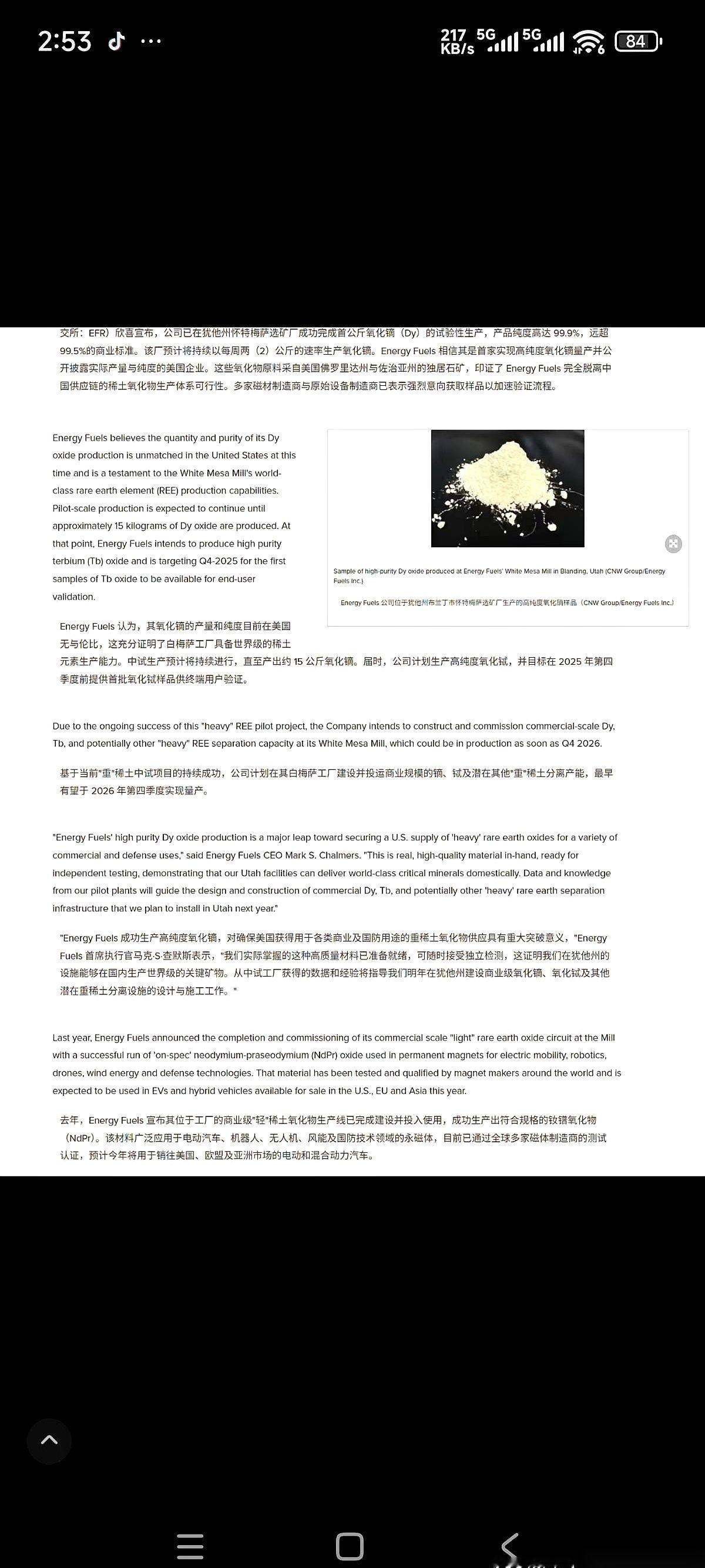 我天,刚刷到个新闻,差点把水喷出来。 美国那边一家公司,号称在稀土提纯上取得了“重大突破”。 周产量,2公斤。 对,你没看错,两公斤,够我买两袋米的分量。 搞的是啥呢?叫“氧化镝”。这玩意儿是干啥的?芯片、尖端磁铁,核心中的核心。但凡高精尖一点的,都得要99.99%起步,五个9、六个9才算入了门。 他们这个“重大突破”,纯度99.9%。 而且啊,人家要的是“金属镝”,他们搞定的是“氧化镝”。差着辈分呢,哥们儿。这就好比人家要吃一碗香喷喷的白米饭,你端上来一把带壳的稻谷,说你看我这稻谷多饱满。 最逗的是什么?是产量。 他们一个月吭哧瘪肚能搞出15公斤,还只是“希望”年底能稳住。 我们呢? 就上个月,氧化镝的产量是292.9吨。 吨!T-O-N! 我数学不好,谁来帮我算算,这是多少倍? 真的,有时候我都怀疑,我们跟他们聊的,是不是同一个工业体系。 他们那叫实验室成果展示会,我们这叫大工业生产。