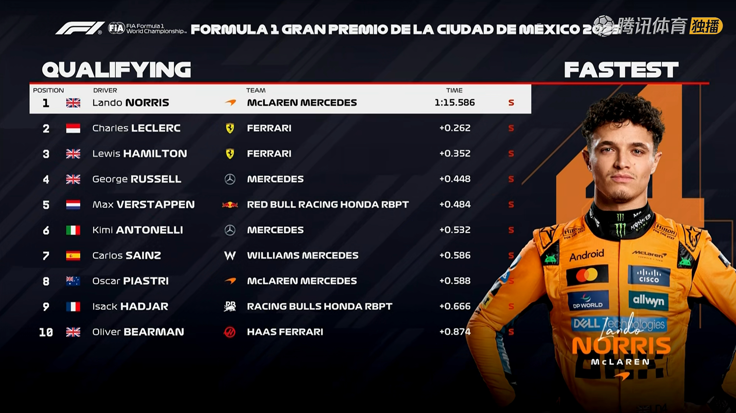 墨西哥城大奖赛排位赛成绩表F12025F1墨西哥城大奖赛​​​