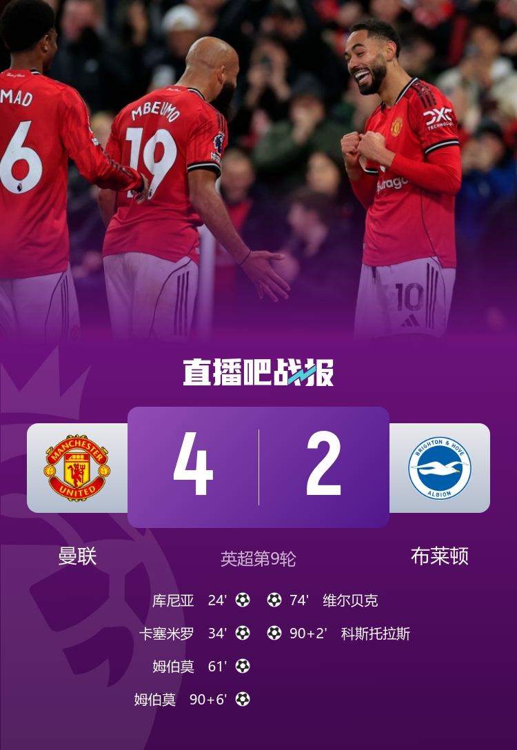 曼联4-2布莱顿取三连胜姆伯莫双响卡塞米罗传射库尼亚破门
