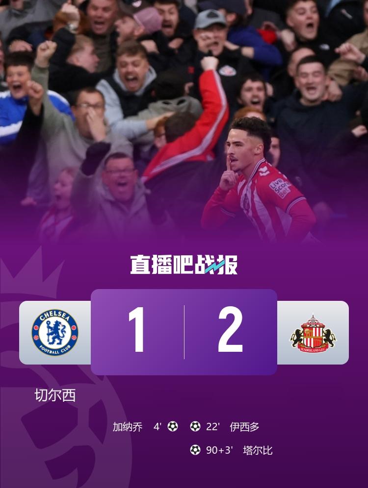 桑德兰先赛升第二,切尔西各项赛事四连胜终结!塔尔比第93分钟替补绝杀。