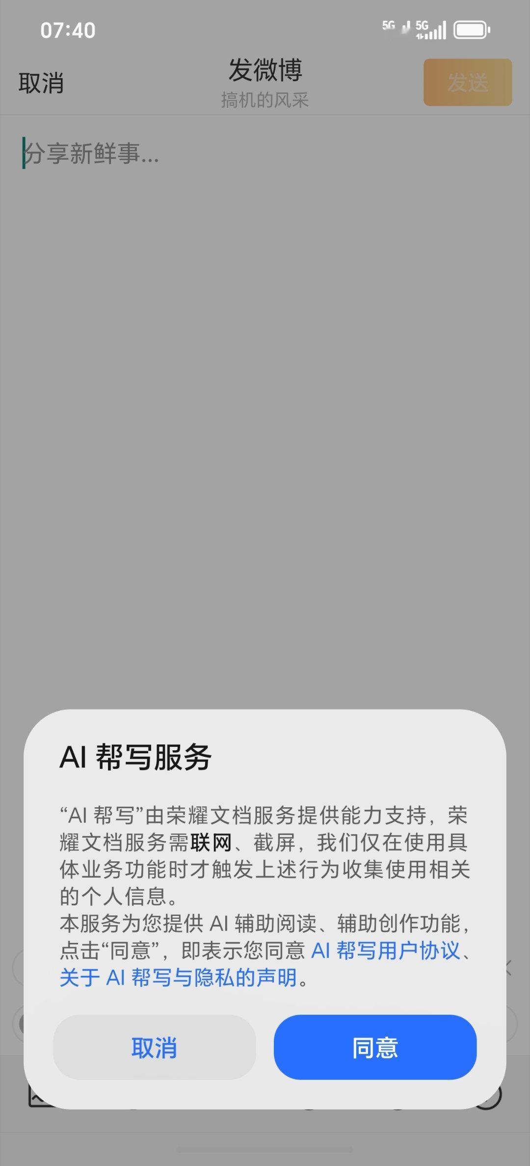 家人们早上好!这条博文下面的内容用了荣耀AI智能配文,大家觉得如何?[doge]