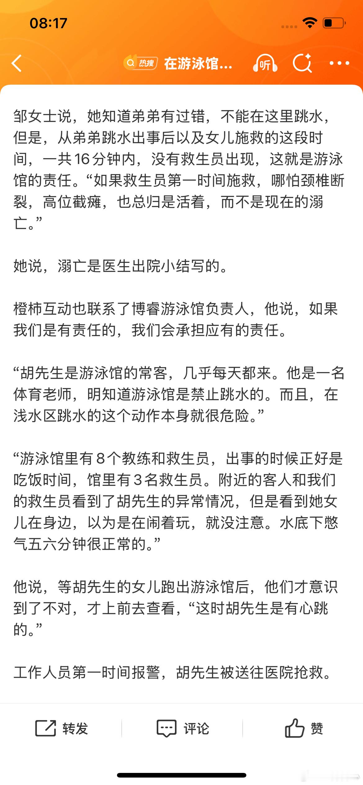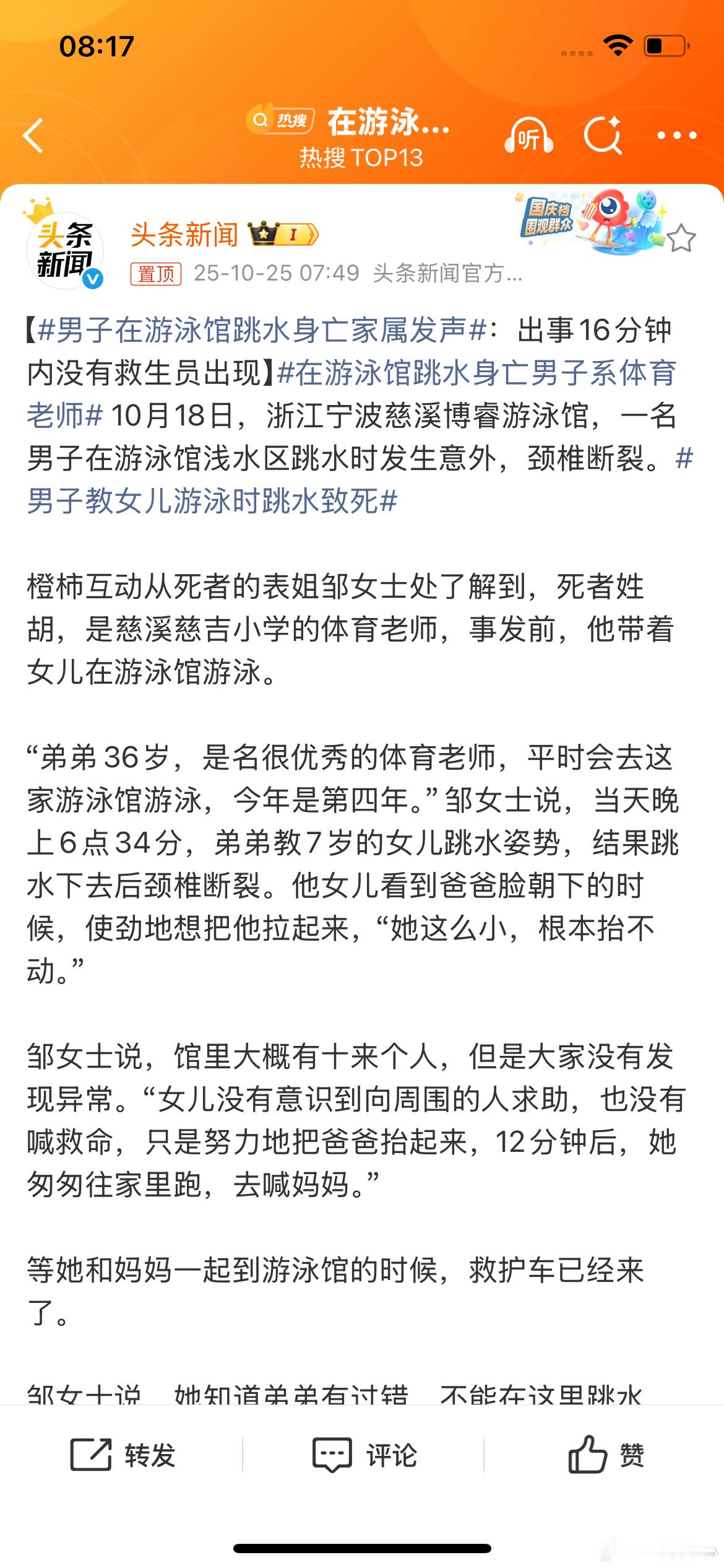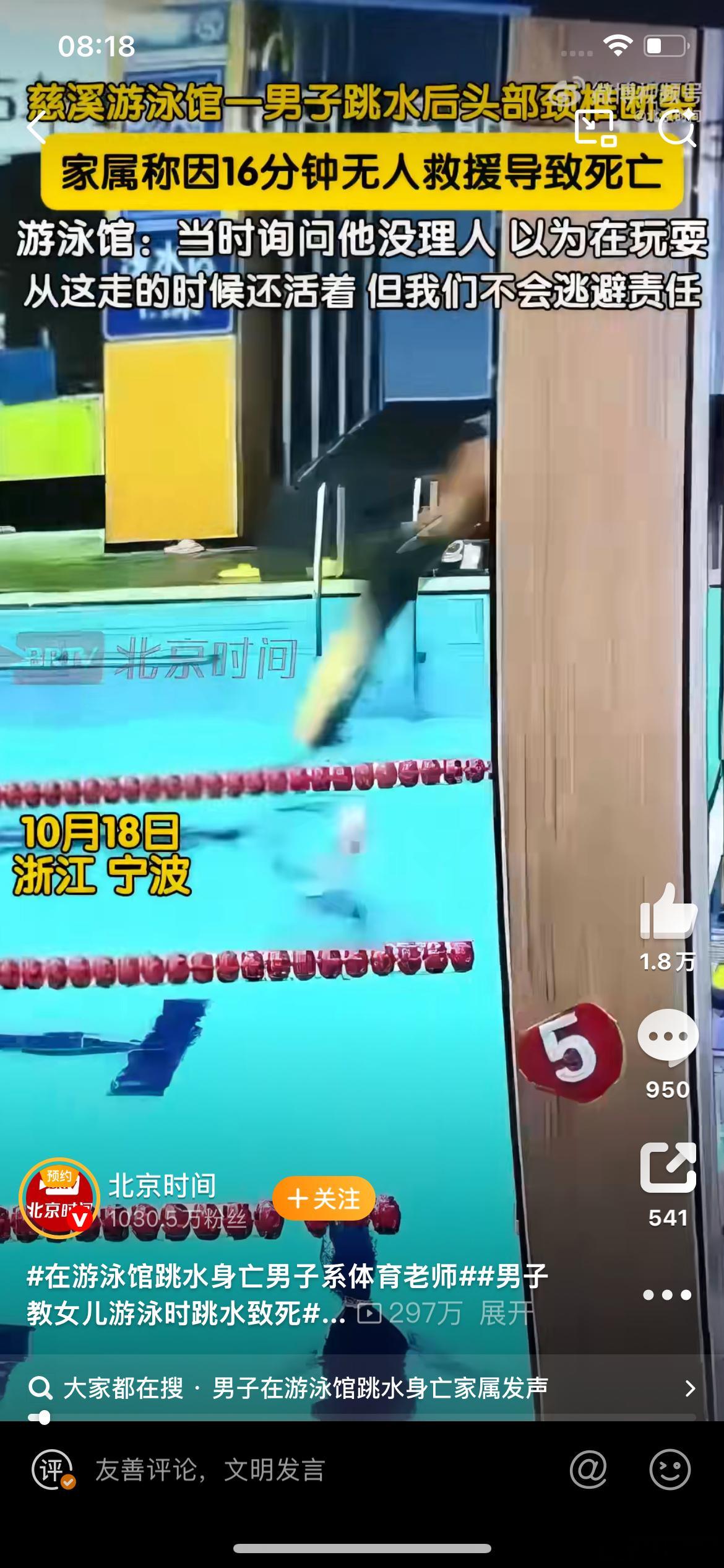 在游泳馆跳水身亡男子系体育老师