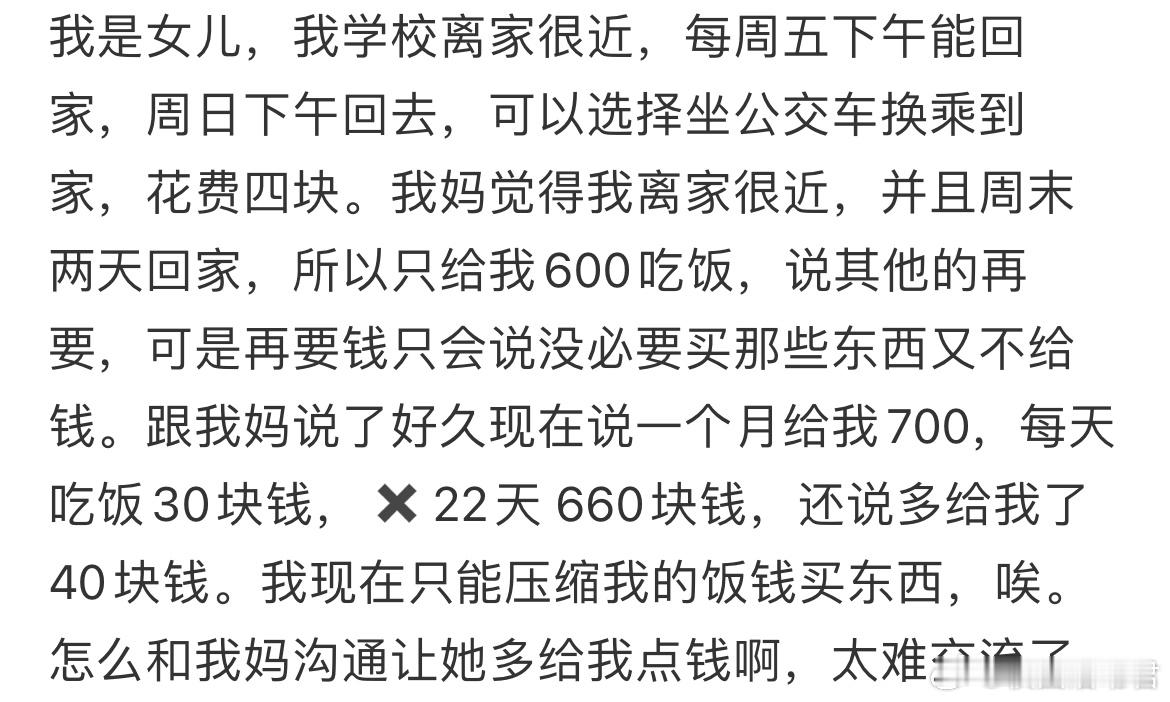 女儿大学离家近,每周回家,我可以只给她600生活费吗?
