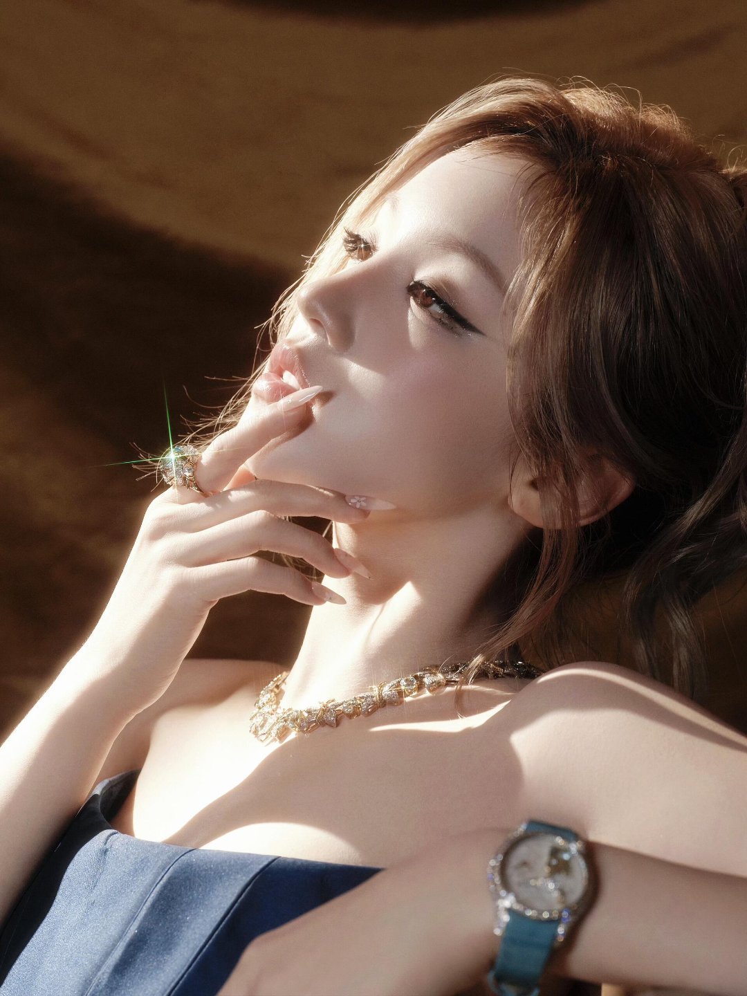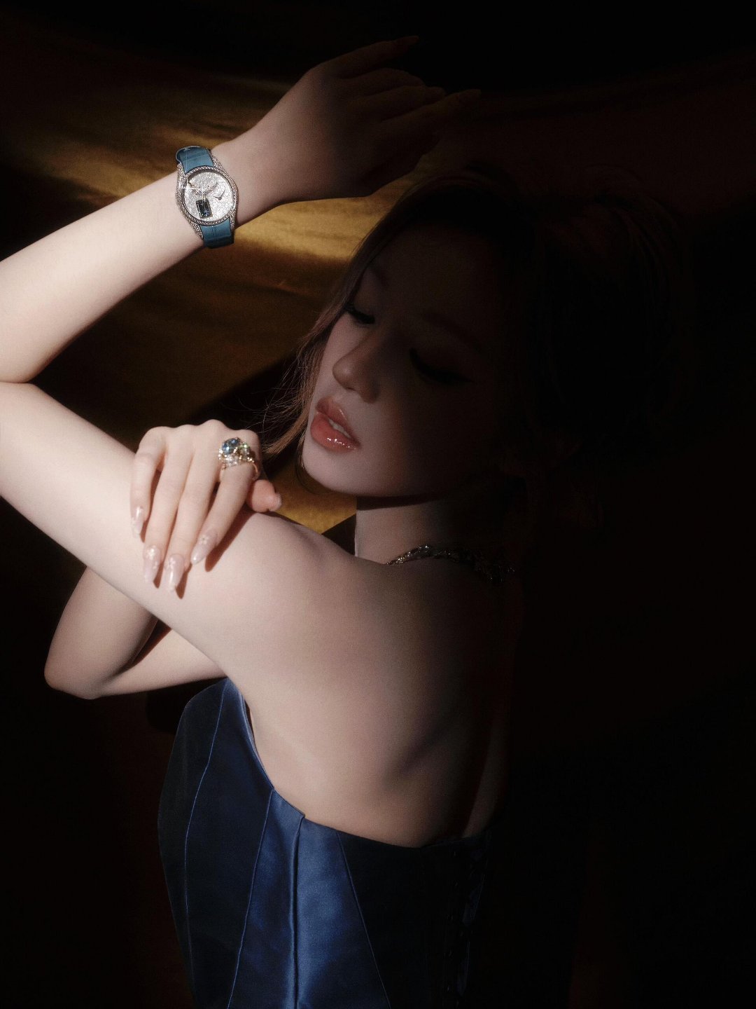 一袭Elio Abou Fayssal蓝色羽毛拖尾抹胸礼服,搭配全套蒂芙尼高级珠宝及腕表,将奢华演绎到了极致。