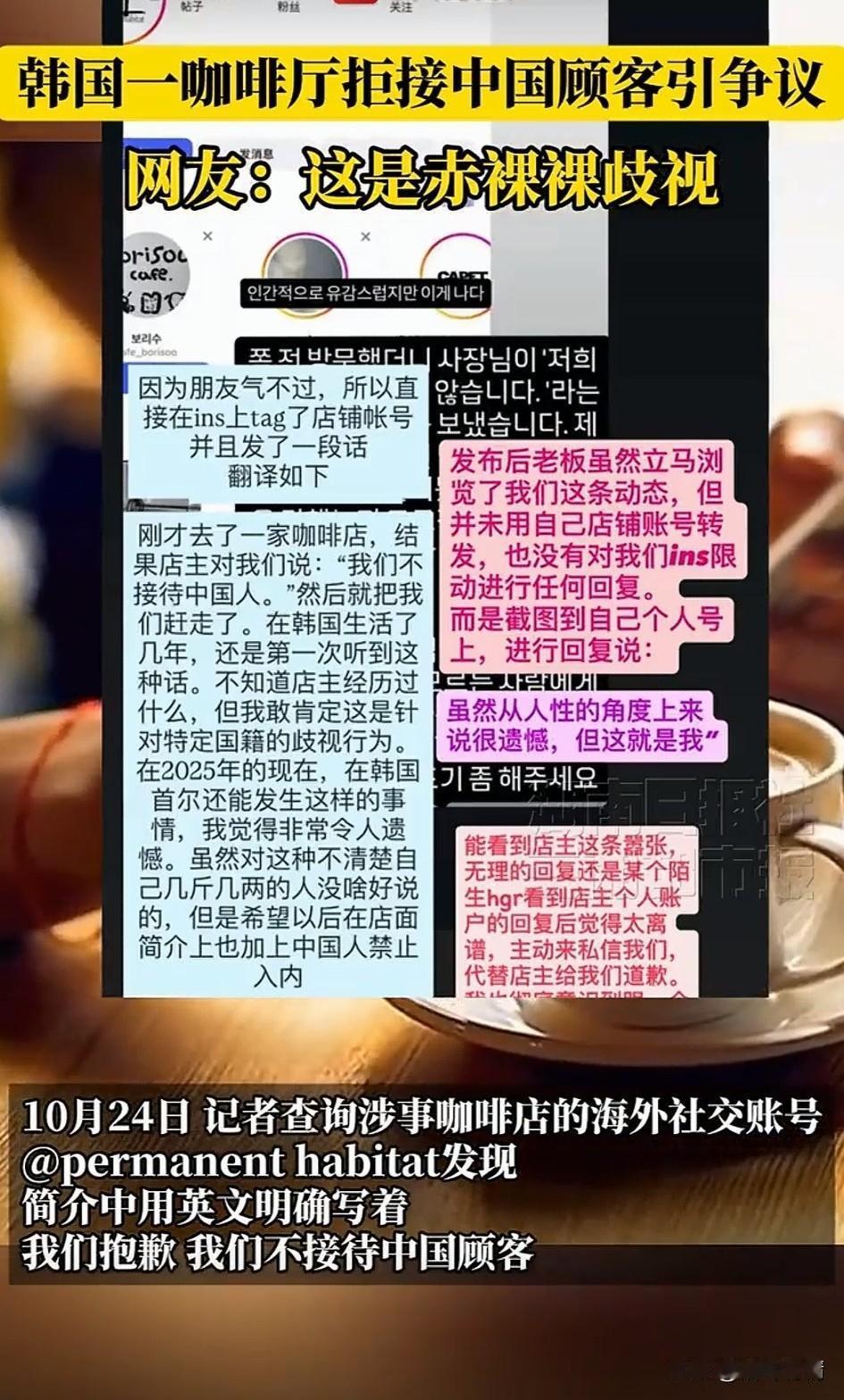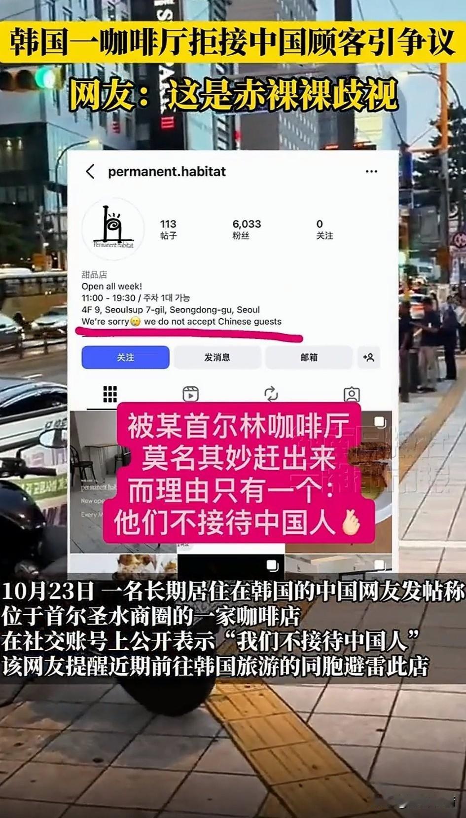 近日韩国咖啡厅拒接中国游客惹争议, 10月23号一名长期居住在韩国的中国网友发帖子位于韩国圣水商圈的一家咖啡店,拒接中国游客,请避雷此店。 她表示在韩国这么多年没见过这种店铺,这次被她碰到后,他她也是想着提醒国内游客不要去这家店不消费,以免被这家店铺区别对待。之前他也是去这家店买咖啡,款都付过了,当店主得知她是中国人后,立刻让她出去,连咖啡都不让她拿。于是她就把这段经历分享了出来。他也浏览了这家店铺老板的ins账号将她在店铺的经历评论上去,后来老板浏览过后没有回复她,只是将她的质疑截图后发在自己的社交账号上,表示这就是我。10月24号记者查询该社交账号,发现了这家店铺 确实在他的社交账号上写了不接待中国游客。 我国旅游资源丰富,各种自然环境都有,不知道为什么有这么多人喜欢去韩国旅游,众所周知,韩国只有整容业比较发达,其他根本没法和中国国内比。人家既然都不接待了,就不要厚着脸皮去给人家带来不便。 大家对于韩国咖啡厅拒绝接待中国客人怎么看? 每人推荐一个旅行目的地 韩国圣水探店 韩国景点真相