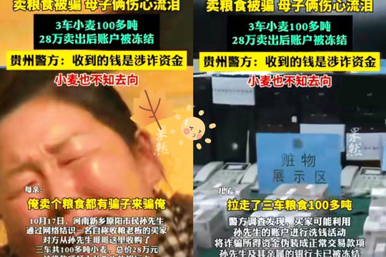 河南新乡,一对母子卖小麦,3车小麦共100多吨,卖了28万,买家把钱打到他们卡上,一家人很高兴,可高兴劲儿还没过多久,她们却发现自己的银行卡被冻结了 这种套路早不是孤例,山东、河南都出过类似事,骗子专挑农户下手,就因为交易监管松、人实在。 更气人的是,法律明明说“善意取得”的钱不该追,这母子不知情、按市价卖粮,完全符合规定 。 可现实里,解冻往往要等好几个月,春耕钱、过冬钱全被卡着。这哪是追赃,分明是让守法的人替骗子买单。 防骗不光要当面交易,更得留好所有凭证,一旦出事赶紧找警方申诉。 你觉得该怎么帮这些无辜农户减少损失?遇到大额交易你会留哪些证据?