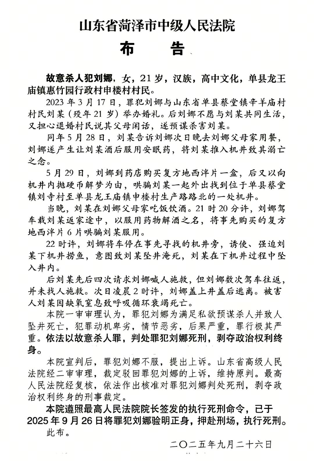 这个就是山东菏泽的刘娜!外表看来清纯又甜美,结果结婚不到两个月,就哄骗丈夫吃药使其坠井淹死! 这到底什么仇什么怨啊!细细了解之后发现人家丈夫根本什么都没有做,简直就是一个无辜的人。 仅仅因为刘娜自己不想过日子了,但是又担心被说闲话,索性心一狠就把丈夫给杀害了。 刘娜19岁,菏泽单县人,上完高中就不念了,很快就和同村村民刘某结婚。看上去两个人应该是村民互相介绍的,觉得合适就结婚了。 却没想成婚后两个月,刘娜就反悔了,他不想和丈夫过日子了,但是又担心乡里乡亲的说父母闲话,内心有了一个可怕的计划:谋杀亲夫! 她自己本身是一个行动派,在某一天丈夫来娘家吃完饭后,她先在车上以醒酒药物为由哄骗丈夫吃下了5片复发地西泮片,然后用自己做噩梦了想去找机井抛硬币解梦的理由,两人找到一处没有什么人的机井。 最后又让丈夫下井捕鱼将其淹死。丈夫在井里面不断的求救好几次,但是刘娜不闻不问,也不找人来救。 井中有鱼本来就是一个很荒谬的事情,但是她的丈夫因为爱他才下去,估计当时觉得是以为开什么玩笑吧,但是没想到他的妻子却存着害他的念头。 看到这儿我真的想不明白了,你说她胆小吧,她连流言蜚语都害怕,但是他又胆大的连杀人都不眨眼 。 所以,我们说婚姻一定要建立在爱情的基础上,因为爱两个人结合,而不是觉得合适匆匆结婚,大家怎么看呢?