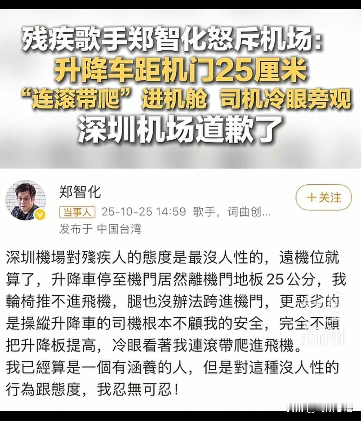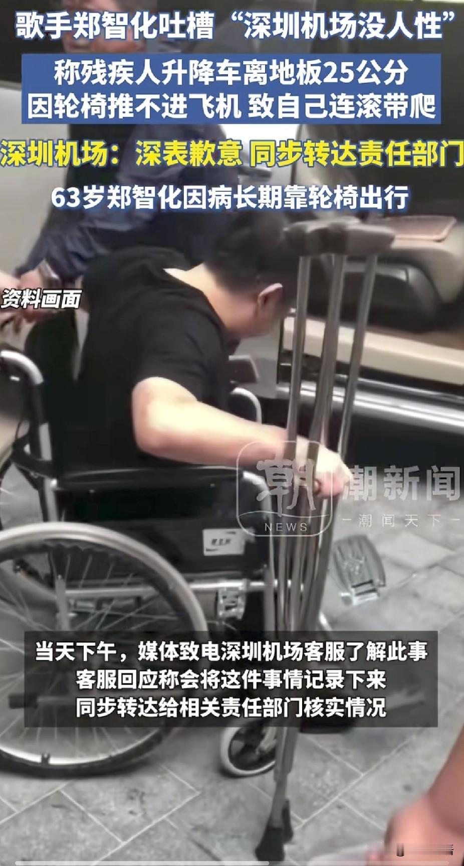 郑智化在深圳机场遭遇尴尬一幕:25厘米的高度差,背后是千万残疾人的出行难题 知名歌手郑智化最近在网上发帖,吐槽在深圳机场的一次糟心经历。他登机时发现,机场接驳的升降平台和飞机舱门地板之间,高度差居然有25厘米,远远超过规定中不超过5厘米的标准。 由于身体不便,郑智化无法跨过这25厘米的坎。他说自己最后几乎是连滚带爬才勉强进了机舱。而更让他寒心的是,旁边的升降机操作员和司机全程冷漠旁观,没有一个人主动伸手帮忙。 事情曝光后,深圳机场在郑智化社交账号下留言道了歉。但光道歉肯定不够,真正该问的是:为什么会出现这种服务上的冷漠? 机场本来算是服务比较到位的地方,却依然暴露出这样的问题。这不禁让人怀疑,有些职业微笑只是装装样子,一旦遇到真需要帮忙的情况,就暴露了真实态度。 郑智化这次吐槽能引起这么大反响,虽然有名人的因素,但更深层的原因是,很多人对残疾人遭遇不人性化对待感同身受。 有网友说:郑老师可能不是第一个遇到这种事的人,但他是第一个敢站出来说的。 还有网友点评:问题还是老问题,但通过郑智化说出来,就变成了“新”问题。这个“新”字,挺值得琢磨。 当然也有不同声音:深圳机场本来是我最满意的国际机场,这次能听进去意见,及时改进特殊旅客服务,还是值得点赞的。 全国有8500万残疾人,但我们在街上却很少见到他们。根本原因就是社会的无障碍设施太缺了,就算有也常常形同虚设——比如盲道被占、坡道不畅。 残疾人出门麻烦重重,很多人只好选择少出门、不出门。这才是“街上看不见残疾人”的真正原因。 一座城市、一个单位,特别是机场这类服务场所的无障碍通道是否畅通,直接反映出它的文明程度。无障碍设施做得好不好,是衡量社会文明的一把尺。 虽然现在对无障碍设施有明确规定,但很多地方既没放在心上,也没落实到位。规定成了纸上谈兵,残疾人依然得不到实实在在的便利。 眼下不光是设施建得不够,很多已有的设施也不能正常使用,成了摆设。残疾人的出行需求,依然被忽视。 郑智化这件事是一个提醒:怎么善待残疾人、如何完善无障碍环境,应该成为衡量社会文明的重要标准。只有真正重视起来,才能让残疾人愿意走出家门,融入社会生活。