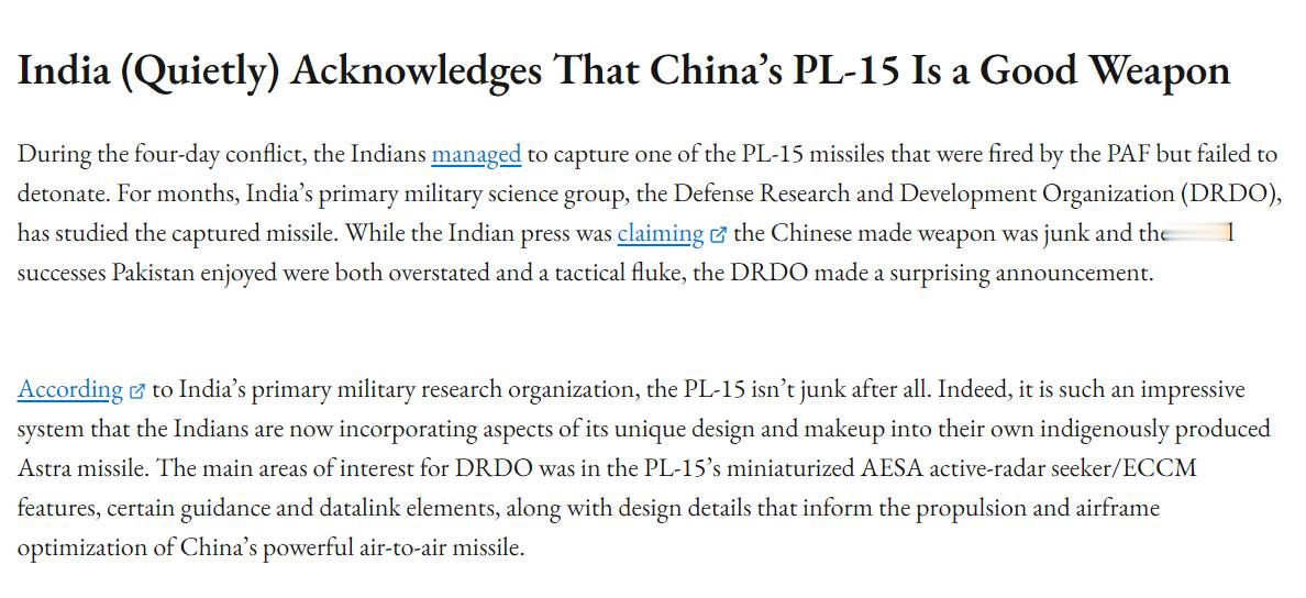 当初敢于揭露印度空战失败而惨遭网暴的美国专家终于扬眉吐气。他在美媒新发了一篇文章“鞭尸”印度,称印度口嫌体直,已经用实际行动承认:中国的PL-15是一件好武器。