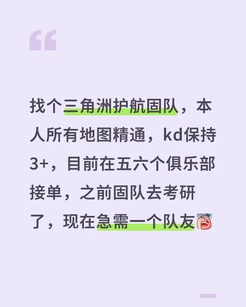 找个三角洲护航固队,本人所有地图精通,kd保持3+,目前在五六个俱乐部接单,之前 找个三角洲护航固队,本人所有地图精通,kd保持3+,目前在五六个俱乐部接单,之前固队去考研了,现在急需一个队友[伤心]