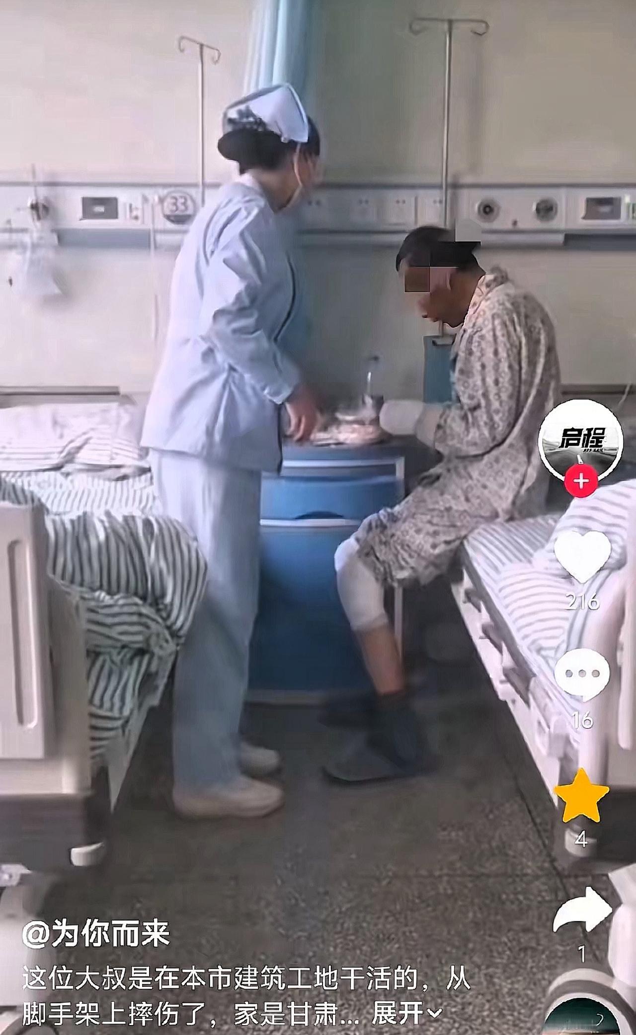 辽宁护士的“谎言”太暖!这才是普通人最该有的善意 辽宁鞍山病房里的一幕,把人看哭了!甘肃来打工的大叔,从脚手架摔下来伤了腿,怕家人担心就瞒着所有人,一个人住院,打份菜分几顿吃,有时连晚饭都省了。 还好有位护士看在眼里,悄悄每天给他打三餐,还撒谎说“食堂饭免费,多打份不碍事”。谁都知道医院打饭要饭卡,哪来的免费?她就是怕伤了大叔的面子,才自己掏腰包帮衬。 这事儿最戳人的,就是那份“不张扬”。大叔硬扛苦不声张,护士帮忙也不声张,没喊口号没求表扬,就只是见人难了,悄悄伸个手。 生活里的温暖从不是惊天动地的大事,就是这种藏在细节里的体谅。 那些说“善良离得远”的人,其实是没看见这些细碎的光。你们遇到过这种“悄悄帮你”的温暖时刻吗?