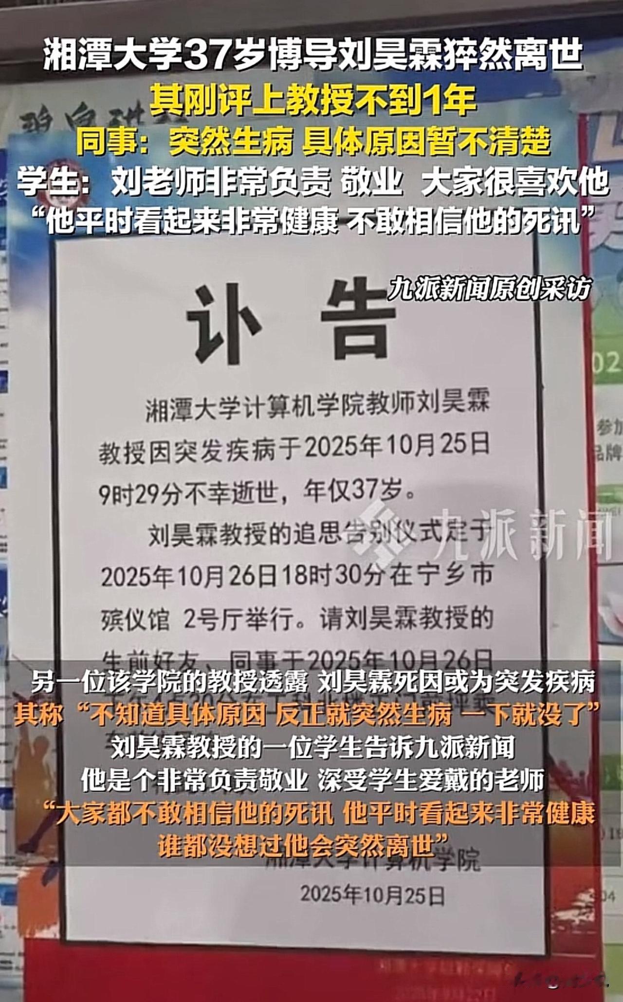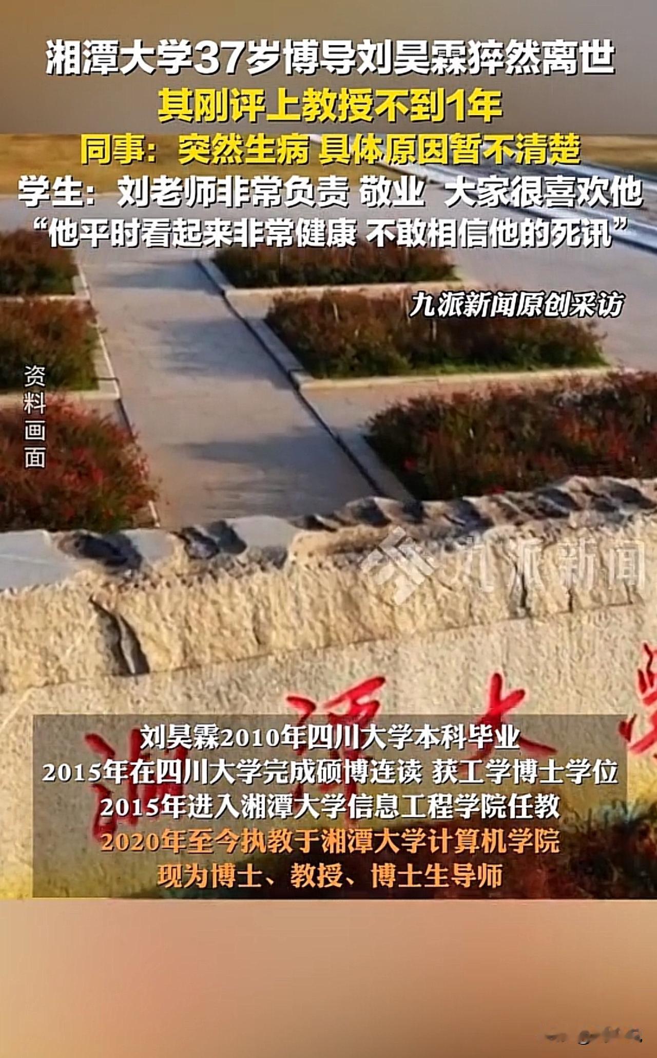 #湘潭大学37岁教授刘昊霖去世#痛心!湘潭大学37岁博导猝然离世,评教授不足一年,学生一句话看哭网友! 10月25日晚,一则消息让无数人揪心:湘潭大学计算机学院37岁教授刘昊霖突发疾病不幸去世。这则消息很快引发热议,该校学生的留言更戳中人心:“昨天下午他刚给我们上了Linux最后一课,还划了重点,我录了音,今天听消息像做梦。” 校方随后证实了此事,刘昊霖的追悼会将在老家宁乡市殡仪馆举行。公开信息显示,他2015年起执教湘潭大学,2024年11月申报教授职称,评上教授尚不足一年,已是博士生导师。 对于这位37岁教授去世,网友纷纷扼腕:“太可惜了,37岁正是干事业的黄金年纪,还是博导,损失太大了。”! 也有网友感叹:“学生的话最戳人,前一天还在上课,生命太无常了。科研和教学连轴转,一定要保重身体啊!” 这则消息,周少不得不说真令人痛心疾首。37岁的教授、博导,正是学术生涯的上升期,却因突发疾病离世,既是学校的损失,更是教育界的遗憾。 学生口中“负责有耐心”的评价,印证了他的师者担当。当然,这事这也警示我们,在追逐事业的同时,务必守住健康底线,毕竟生命才是一切的基础。 对于湘潭大学这位37岁教授去世,大家有什么感想?#寻美三湘# #长沙新朋友#