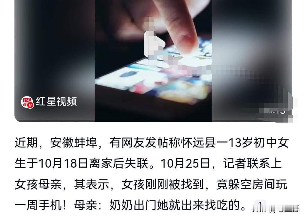 这真是有点过于离谱了。 如果不是在网上亲眼所见,我是万万不敢相信。 竟然会发生这样的事情。 近日,13岁女孩失联7天竟躲空房间玩手机。 母亲称:奶奶出门,她就出来找吃的。 13岁的女孩竟然做出这样的事情。 感觉只有极度内向的人才干得出来这种事情。 由于这个女孩上班打瞌睡,妈妈禁止她玩手机,她就离家出走。来到了奶奶家的空房间。 这真的是太疯狂了。 竟然逃学这么多天。