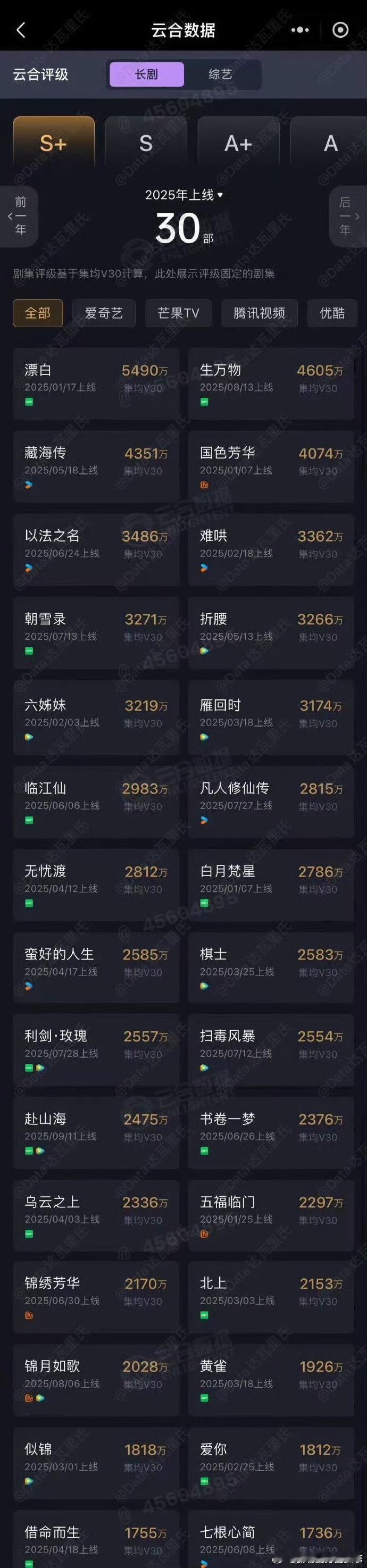 云合v30准确数据出了 !破4000万以上的四部,漂白 生万物 藏海传 国色芳华