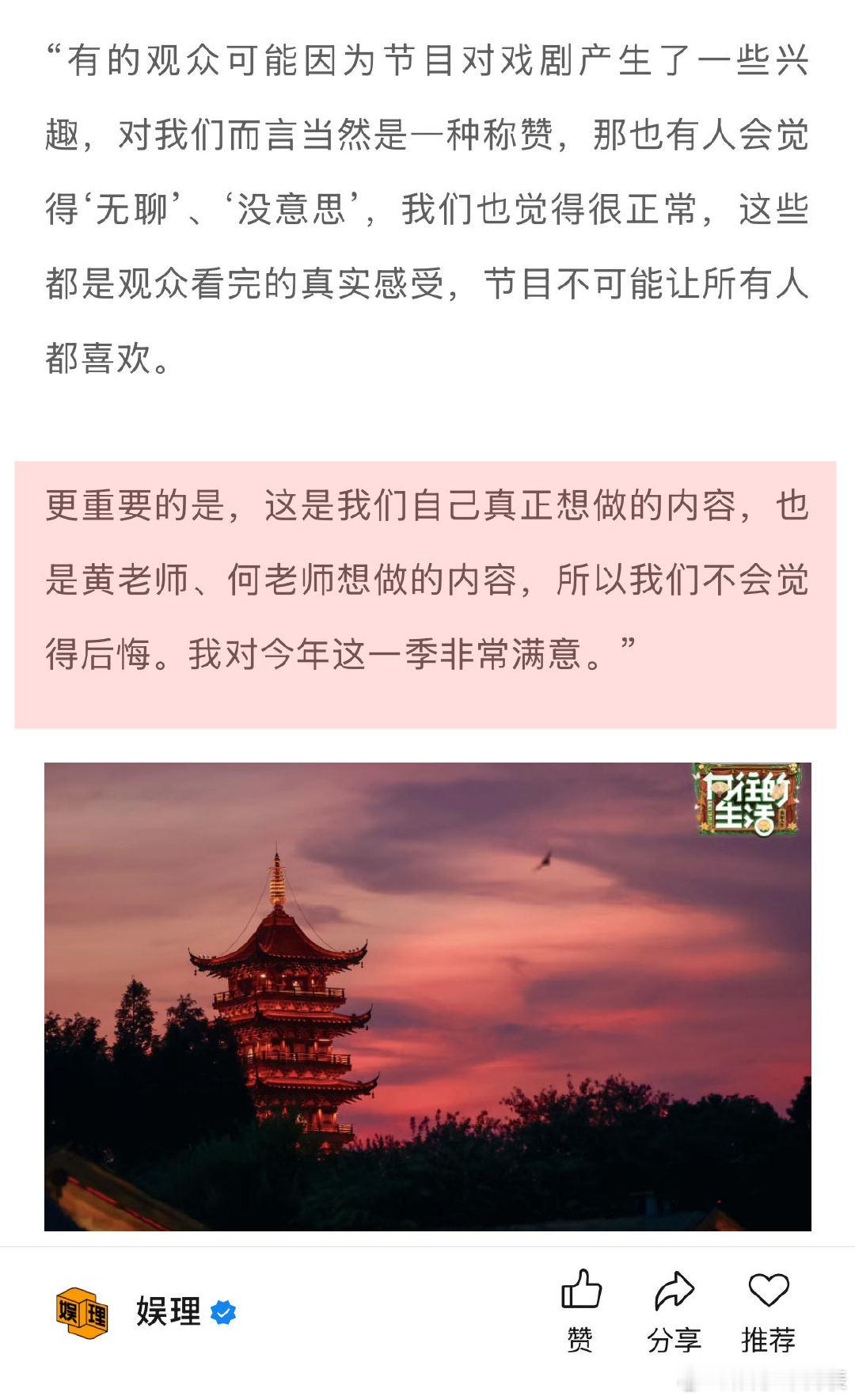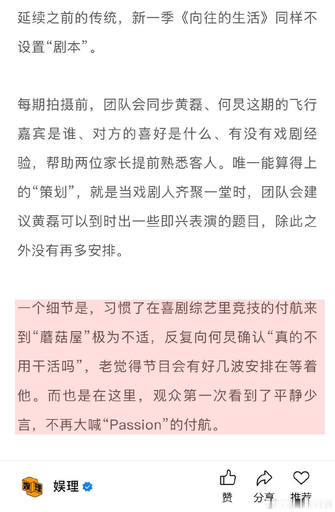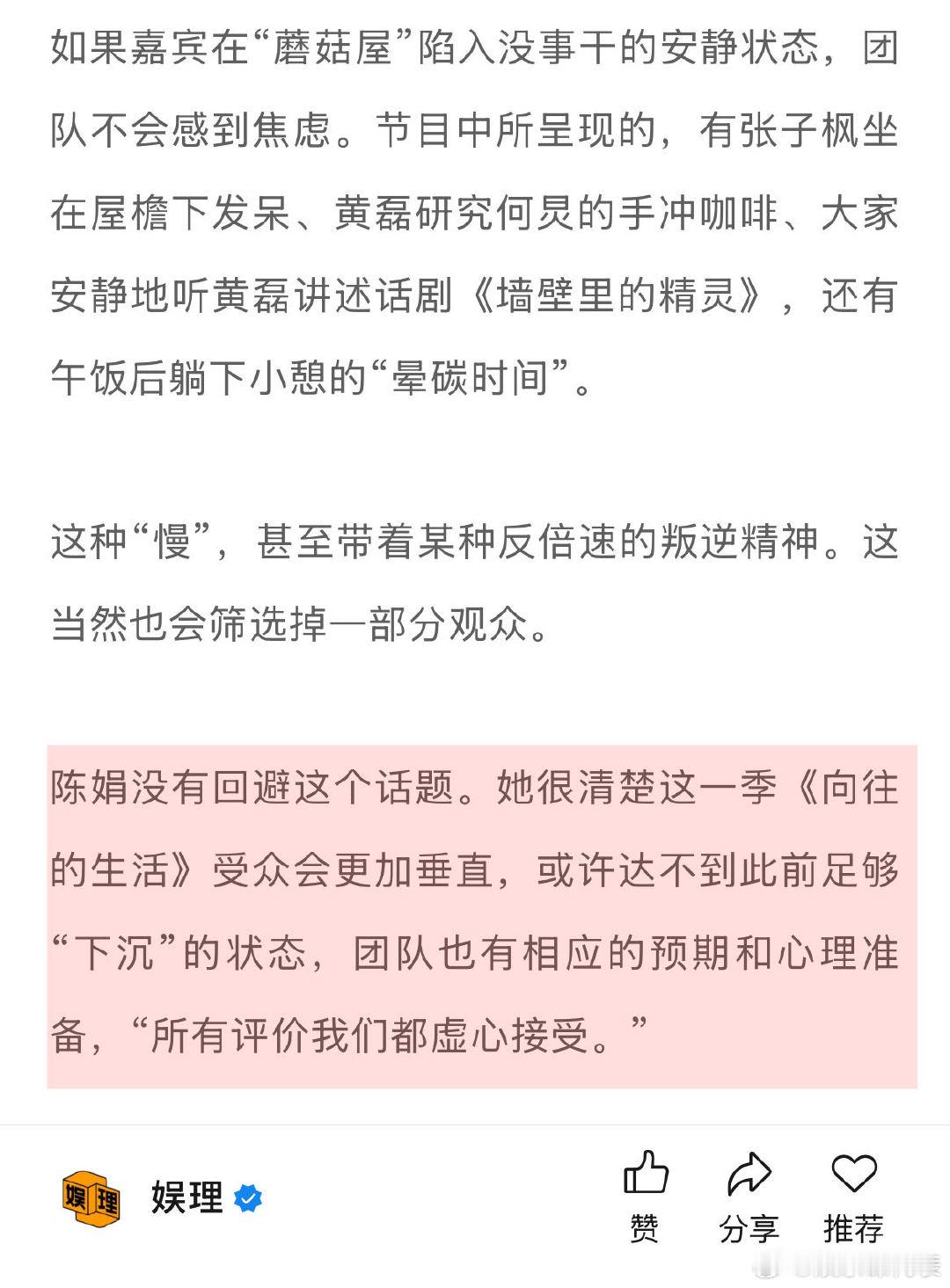 张子枫刚录向往的生活时很焦虑 导演说张艺兴在向往的生活很自律 谈及本季《向往的生活》被评“平淡”时,总导演陈娟认为这不是贬义词。“前两天我妈妈问我‘你们节目是在干什么’,她有点儿看不懂,我说就是大家聚在一起玩。在我看来‘向往’不是那种要不断刺激你、不断抛梗的节目,但会让你的心情很平静,没有那么焦躁。”娱理独家↓