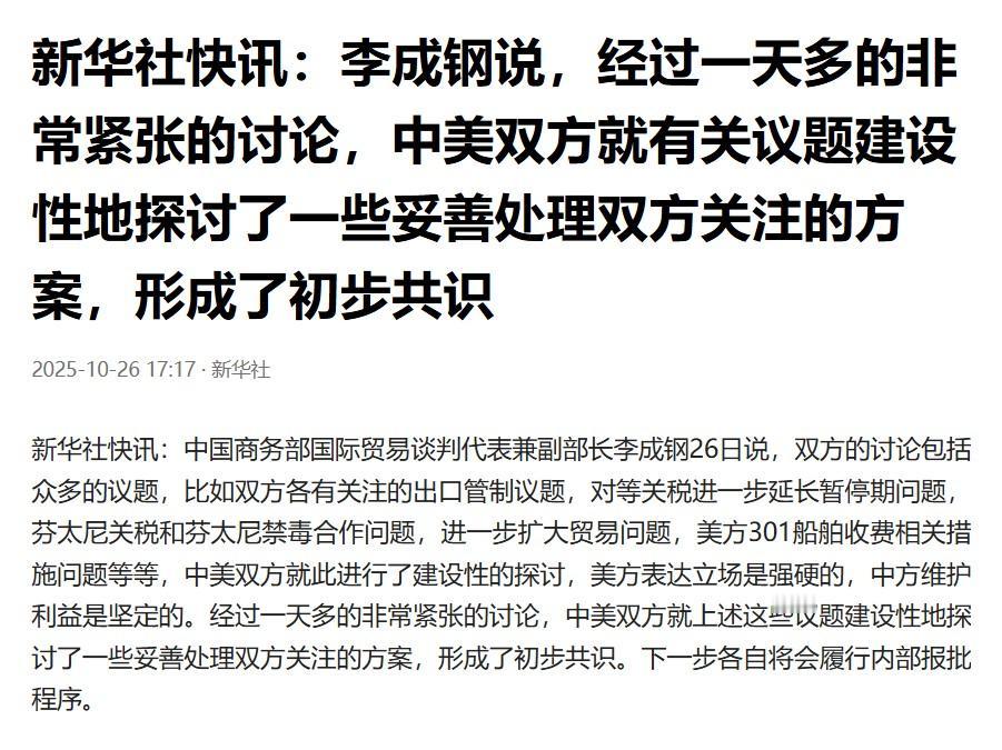 中美双方就多个议题形成了初步共识中美经贸团队进行深入坦诚的交流头号创作者激励计划从通报的内容来看,中美经贸易团这次的会谈基本上是各说各话,态度都很强硬互相不妥协,也就是一次吵架大于共识的谈判。通报用的词是“中美双方就此进行了建设性的探讨”,也就是说都各自声明了自己的态度,实质性的商定的具体事不多。但也不是完全没有成果,更没有谈判破裂,而是初步形成了一些共识。从“下一步各自将会履行内部报批程序”这句话来看,可能还是双方各自延长关税的实施时间,或者各自减轻关税数额。静等后面的再次通报。